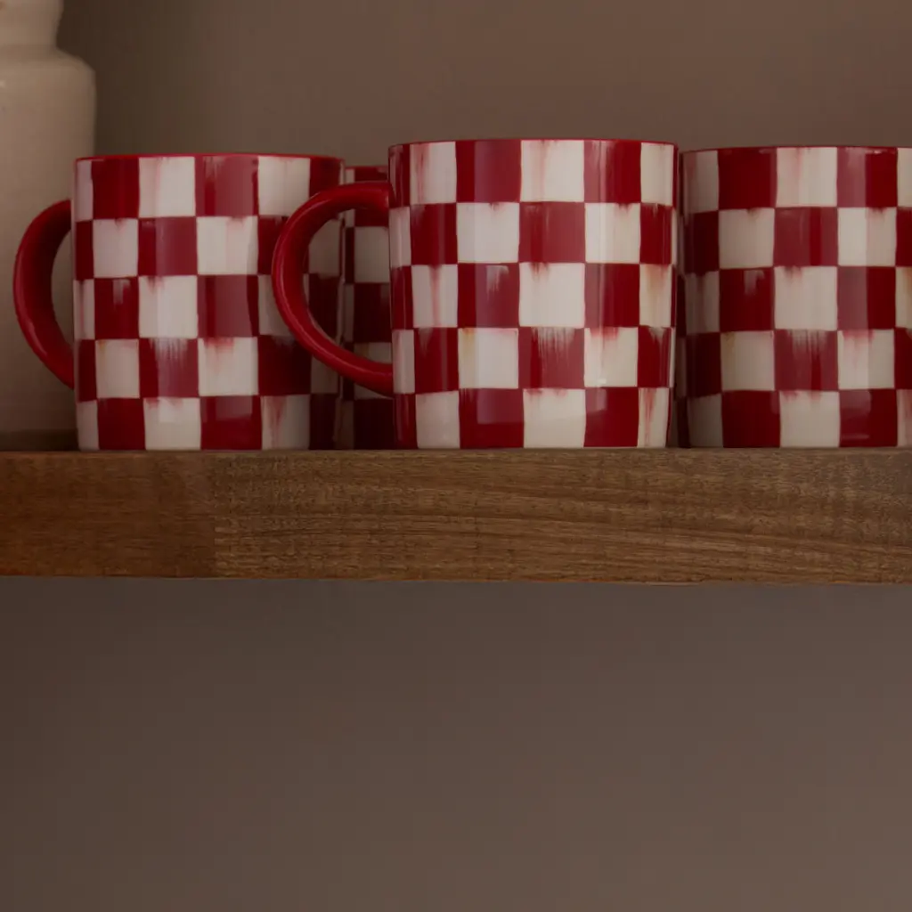 Our iconic check pattern in rich crimson shades? These Cherry Check Mugs are the cherry on top of your table. Designed for everyday use, they are crafted from durable stoneware that's both dishwasher and microwave-safe. Pair with other Cherry Check stoneware pieces or mix and match for a truly unique tabletop collection. Comes in a set of four.