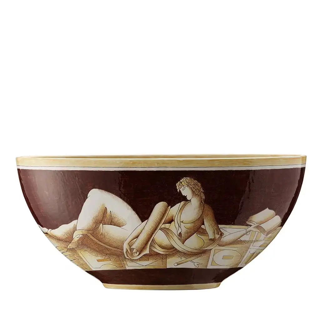 This stunning bowl is part of La Conversazione Classica collection, which in Italian translates with Classical Conversation, designed by brilliant artist Gio Ponti. Effortlessly combining various elements taken from classical and Neo Classical art, the subjects of this series create a universe in which multi-colored backgrounds are enlivened with dream-like scenes. On this oval bowl, the deep blue background is adorned with a cherub playing with a dog. Pompeian influences and Renaissance inspirations are clearly visible in this superb work of art.