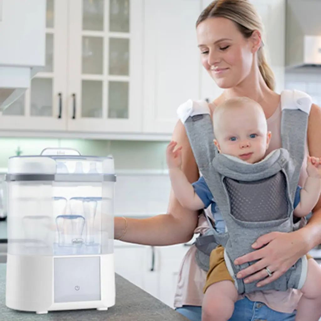 The Advanced Sterilizer & Dryer is an all-in-one system that kills 99.9% of germs and provides 24-hour protection. Sanitizes bottles, teethers, pacifiers, toys and more. Effectively eliminating harmful bacteria with the power of steam.Sanitizes and dries quickly, naturally & quietly. Eliminates up to 99.9% germs with the power of steam. Full size mode holds up to 6 bottles including nipples, cap rings and lids. Compact mode for sanitizing smaller items. Descale alert. Drying settings remove condensation &moisture. No chemicals needed. Product stays sterile up to 24-hours. Coated heating plate. Automatic shut-off & delayed start. Full sterilizing & drying cycle last under 40 minutes. Dimensions: 10.75"L x 7.9"W x 14.75"H.
