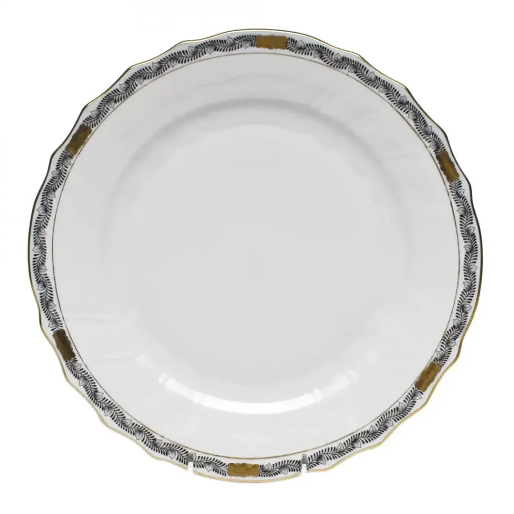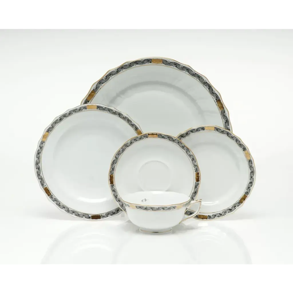 Like a pretty silk ribbon used to tie a bridal bouquet, the garland usually plays a supporting role by embellishing the peony motif of the Chinese Bouquet pattern. Here it becomes the principal source of beauty by draping the edges of its porcelain host with stylized vines and gold rosettes. Hand painted in Hungary. Now the biggest porcelain manufactory in Europe, Herend was founded in 1826 to produce earthenware in the small Hungarian village for which it was named. At the time, Hungary was flooded with low-cost pottery, but in 1839, Mor Fischer became the Manufactory’s new owner and he decided to focus on producing dinnerware replacement pieces for Europe’s royal families to complement their valuable porcelain patterns from Germany and the Far East. As his client base grew, Fischer commissioned his artists to begin designing dinnerware patterns of their own. Queen Victoria’s 1851 purchase of a large set for Windsor Castle was a milestone, setting the stage for aristocrats throughout Europe to clamor for Herend in their estates. In the 1850s, Herend added meticulously-crafted figurines to its creations. Herend’s trademark fishnet pattern, which is widely recognized and prized as Herend’s signature design, started in 1858 when an artist who was intrigued with a Chinese plate’s fish scale design painted it onto a rooster figurine to imitate feathers.