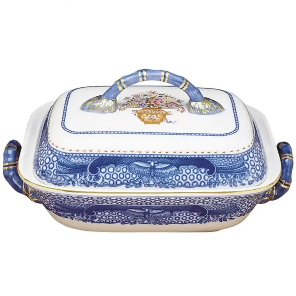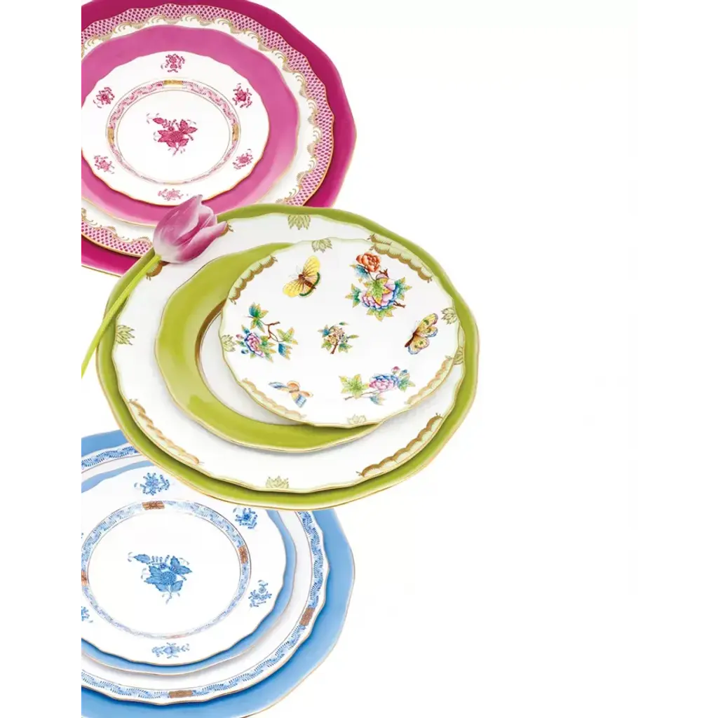 A Herend classic. Originally created in 1930 for Count Albert Apponyi, the pattern features a center motif of a stylized peony surrounded by a garland of leaves with 24K gold rosettes. It is available in multiple color options. Hand painted in Hungary. Now the biggest porcelain manufactory in Europe, Herend was founded in 1826 to produce earthenware in the small Hungarian village for which it was named. At the time, Hungary was flooded with low-cost pottery, but in 1839, Mor Fischer became the Manufactory’s new owner and he decided to focus on producing dinnerware replacement pieces for Europe’s royal families to complement their valuable porcelain patterns from Germany and the Far East. As his client base grew, Fischer commissioned his artists to begin designing dinnerware patterns of their own. Queen Victoria’s 1851 purchase of a large set for Windsor Castle was a milestone, setting the stage for aristocrats throughout Europe to clamor for Herend in their estates. In the 1850s, Herend added meticulously-crafted figurines to its creations. Herend’s trademark fishnet pattern, which is widely recognized and prized as Herend’s signature design, started in 1858 when an artist who was intrigued with a Chinese plate’s fish scale design painted it onto a rooster figurine to imitate feathers.