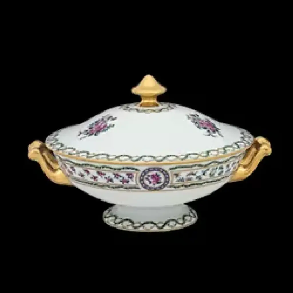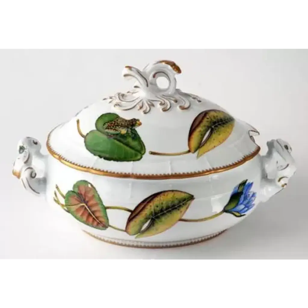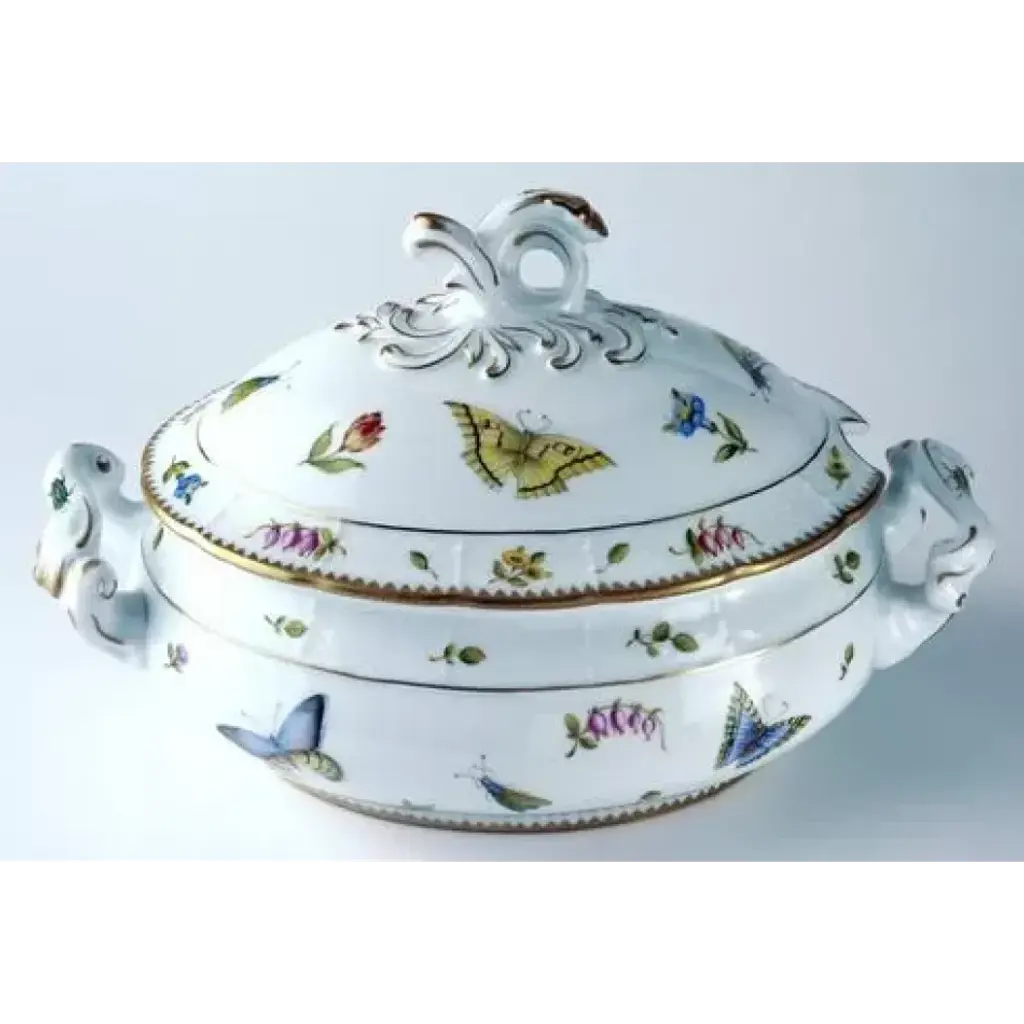 A Herend classic. Originally created in 1930 for Count Albert Apponyi, the pattern features a center motif of a stylized peony surrounded by a garland of leaves with 24K gold rosettes. It is available in multiple color options. Hand painted in Hungary. Now the biggest porcelain manufactory in Europe, Herend was founded in 1826 to produce earthenware in the small Hungarian village for which it was named. At the time, Hungary was flooded with low-cost pottery, but in 1839, Mor Fischer became the Manufactory’s new owner and he decided to focus on producing dinnerware replacement pieces for Europe’s royal families to complement their valuable porcelain patterns from Germany and the Far East. As his client base grew, Fischer commissioned his artists to begin designing dinnerware patterns of their own. Queen Victoria’s 1851 purchase of a large set for Windsor Castle was a milestone, setting the stage for aristocrats throughout Europe to clamor for Herend in their estates. In the 1850s, Herend added meticulously-crafted figurines to its creations. Herend’s trademark fishnet pattern, which is widely recognized and prized as Herend’s signature design, started in 1858 when an artist who was intrigued with a Chinese plate’s fish scale design painted it onto a rooster figurine to imitate feathers.