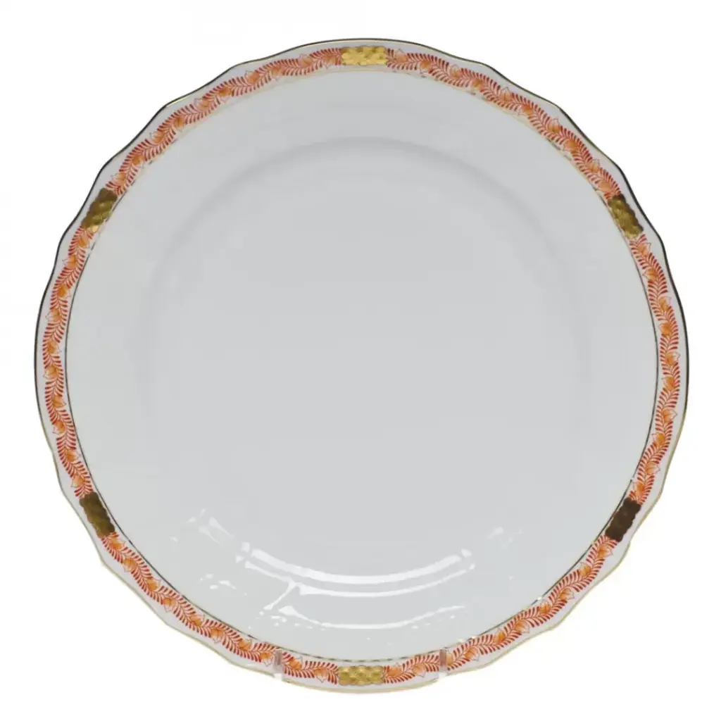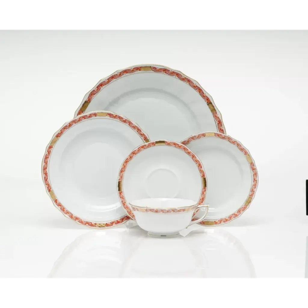 Like a pretty silk ribbon used to tie a bridal bouquet, the garland usually plays a supporting role by embellishing the peony motif of the Chinese Bouquet pattern. Here it becomes the principal source of beauty by draping the edges of its porcelain host with stylized vines and gold rosettes. Hand painted in Hungary. Now the biggest porcelain manufactory in Europe, Herend was founded in 1826 to produce earthenware in the small Hungarian village for which it was named. At the time, Hungary was flooded with low-cost pottery, but in 1839, Mor Fischer became the Manufactory’s new owner and he decided to focus on producing dinnerware replacement pieces for Europe’s royal families to complement their valuable porcelain patterns from Germany and the Far East. As his client base grew, Fischer commissioned his artists to begin designing dinnerware patterns of their own. Queen Victoria’s 1851 purchase of a large set for Windsor Castle was a milestone, setting the stage for aristocrats throughout Europe to clamor for Herend in their estates. In the 1850s, Herend added meticulously-crafted figurines to its creations. Herend’s trademark fishnet pattern, which is widely recognized and prized as Herend’s signature design, started in 1858 when an artist who was intrigued with a Chinese plate’s fish scale design painted it onto a rooster figurine to imitate feathers.
