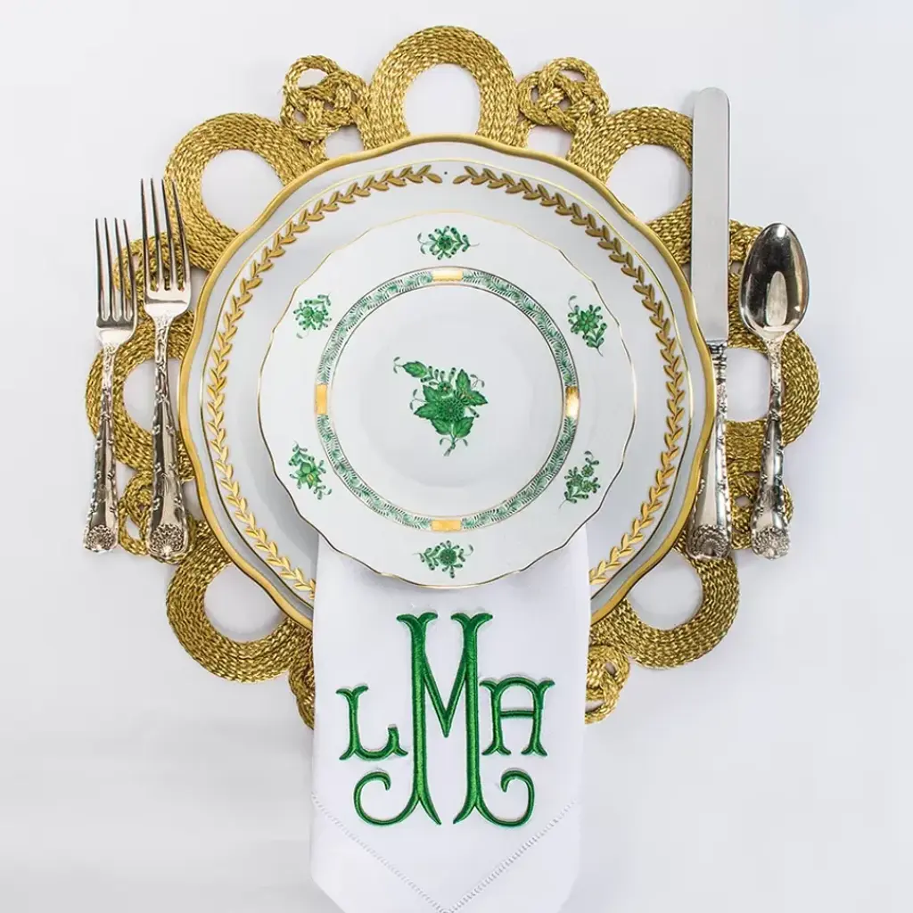A Herend classic. Originally created in 1930 for Count Albert Apponyi, the pattern features a center motif of a stylized peony surrounded by a garland of leaves with 24K gold rosettes. It is available in multiple color options. Hand painted in Hungary. Now the biggest porcelain manufactory in Europe, Herend was founded in 1826 to produce earthenware in the small Hungarian village for which it was named. At the time, Hungary was flooded with low-cost pottery, but in 1839, Mor Fischer became the Manufactory’s new owner and he decided to focus on producing dinnerware replacement pieces for Europe’s royal families to complement their valuable porcelain patterns from Germany and the Far East. As his client base grew, Fischer commissioned his artists to begin designing dinnerware patterns of their own. Queen Victoria’s 1851 purchase of a large set for Windsor Castle was a milestone, setting the stage for aristocrats throughout Europe to clamor for Herend in their estates. In the 1850s, Herend added meticulously-crafted figurines to its creations. Herend’s trademark fishnet pattern, which is widely recognized and prized as Herend’s signature design, started in 1858 when an artist who was intrigued with a Chinese plate’s fish scale design painted it onto a rooster figurine to imitate feathers.
