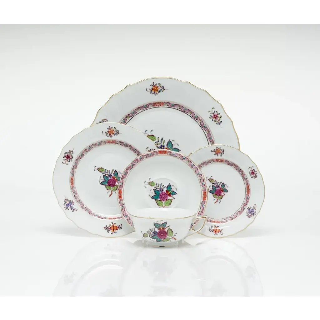 A Herend classic. Originally created in 1930 for Count Albert Apponyi, the pattern features a center motif of a stylized peony surrounded by a garland of leaves with 24K gold rosettes. It is available in multiple color options. Hand painted in Hungary. Now the biggest porcelain manufactory in Europe, Herend was founded in 1826 to produce earthenware in the small Hungarian village for which it was named. At the time, Hungary was flooded with low-cost pottery, but in 1839, Mor Fischer became the Manufactory’s new owner and he decided to focus on producing dinnerware replacement pieces for Europe’s royal families to complement their valuable porcelain patterns from Germany and the Far East. As his client base grew, Fischer commissioned his artists to begin designing dinnerware patterns of their own. Queen Victoria’s 1851 purchase of a large set for Windsor Castle was a milestone, setting the stage for aristocrats throughout Europe to clamor for Herend in their estates. In the 1850s, Herend added meticulously-crafted figurines to its creations. Herend’s trademark fishnet pattern, which is widely recognized and prized as Herend’s signature design, started in 1858 when an artist who was intrigued with a Chinese plate’s fish scale design painted it onto a rooster figurine to imitate feathers.