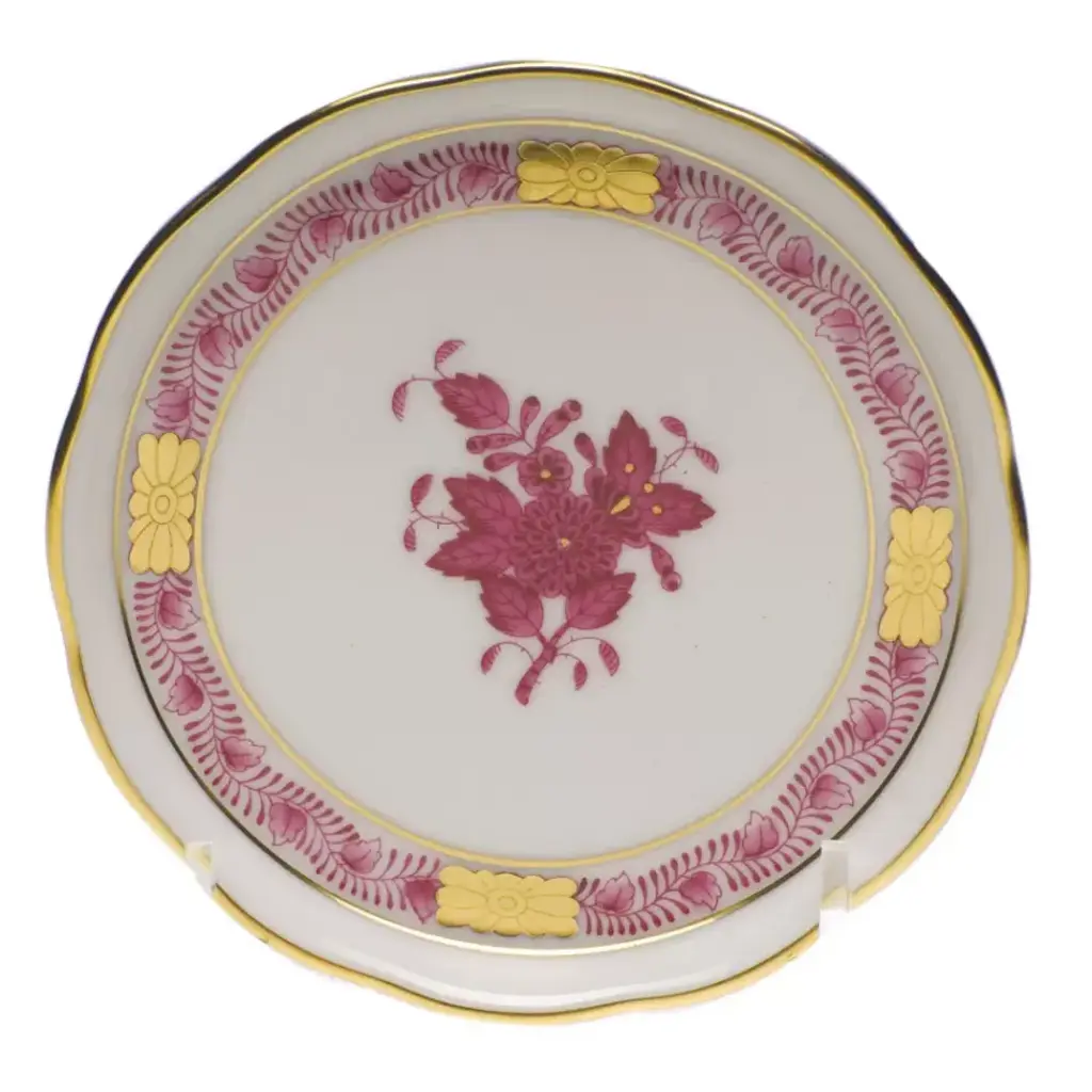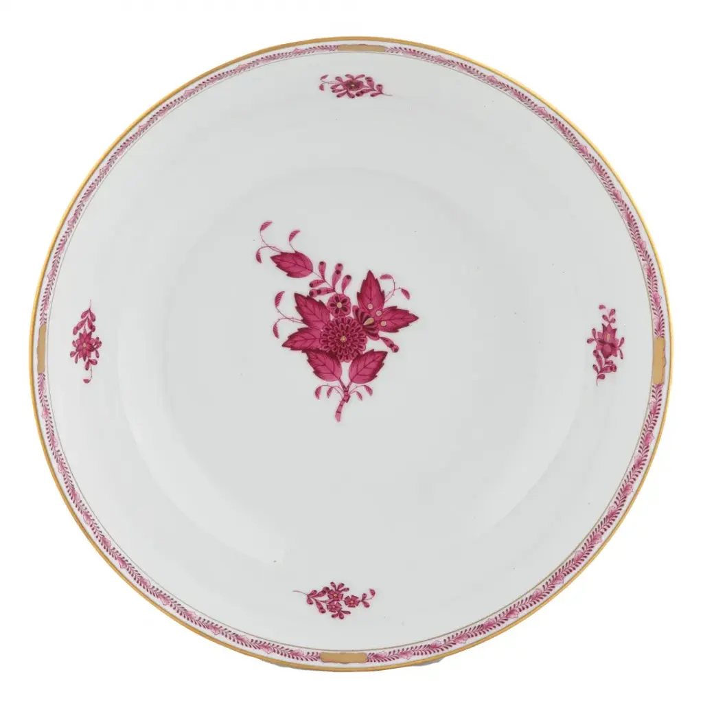 A Herend classic. Originally created in 1930 for Count Albert Apponyi, the pattern features a center motif of a stylized peony surrounded by a garland of leaves with 24K gold rosettes. It is available in multiple color options. Hand painted in Hungary. Now the biggest porcelain manufactory in Europe, Herend was founded in 1826 to produce earthenware in the small Hungarian village for which it was named. At the time, Hungary was flooded with low-cost pottery, but in 1839, Mor Fischer became the Manufactory’s new owner and he decided to focus on producing dinnerware replacement pieces for Europe’s royal families to complement their valuable porcelain patterns from Germany and the Far East. As his client base grew, Fischer commissioned his artists to begin designing dinnerware patterns of their own. Queen Victoria’s 1851 purchase of a large set for Windsor Castle was a milestone, setting the stage for aristocrats throughout Europe to clamor for Herend in their estates. In the 1850s, Herend added meticulously-crafted figurines to its creations. Herend’s trademark fishnet pattern, which is widely recognized and prized as Herend’s signature design, started in 1858 when an artist who was intrigued with a Chinese plate’s fish scale design painted it onto a rooster figurine to imitate feathers.