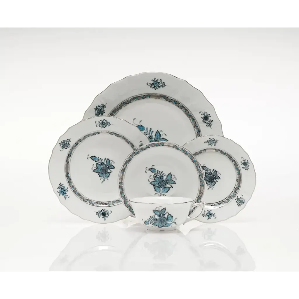 A Herend classic. Originally created in 1930 for Count Albert Apponyi, the pattern features a center motif of a stylized peony surrounded by a garland of leaves with 24K gold rosettes. It is available in multiple color options. Hand painted in Hungary. Now the biggest porcelain manufactory in Europe, Herend was founded in 1826 to produce earthenware in the small Hungarian village for which it was named. At the time, Hungary was flooded with low-cost pottery, but in 1839, Mor Fischer became the Manufactory’s new owner and he decided to focus on producing dinnerware replacement pieces for Europe’s royal families to complement their valuable porcelain patterns from Germany and the Far East. As his client base grew, Fischer commissioned his artists to begin designing dinnerware patterns of their own. Queen Victoria’s 1851 purchase of a large set for Windsor Castle was a milestone, setting the stage for aristocrats throughout Europe to clamor for Herend in their estates. In the 1850s, Herend added meticulously-crafted figurines to its creations. Herend’s trademark fishnet pattern, which is widely recognized and prized as Herend’s signature design, started in 1858 when an artist who was intrigued with a Chinese plate’s fish scale design painted it onto a rooster figurine to imitate feathers.