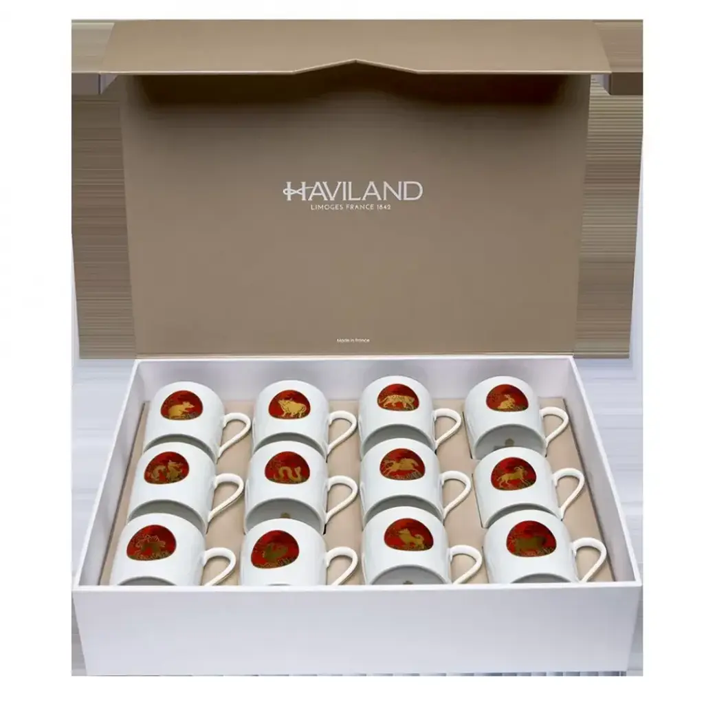 The Haviland collections are distinguished by the elegance of the decorations and the delicacy of the gold or platinum finishes. Remarkable for the retention and resistence of their colors, the timeless Haviland collections endure through time. To this day, Haviland remains one of the few porcelain makers with 100% of its production entirely made in Limoges. The Chinese Horoscope mini mugs collection uses colors that are widely seen as auspicious and used to celebrate the Chinese New Year: red for fortune and joy, and gold for luck and wealth. Haviland Porcelain was founded by David Haviland, an American who moved from New York to France after he was brought a broken tea cup to match and recognized the quality and color of the old piece of porcelain. Filled with curiosity, he went to France to find the factory where the cup had been made, but the samples he was sent were not up to his standards. So in 1841, he moved to Limoges to set up his own factory. Traditional French dinnerware was usually produced in Limoges and sent to Paris for decoration. Haviland insisted on setting up a studio within his factory to have more control over the designs. Renowned artists, including Cocteau, Dali, and Kandinsky have played a role in the company's designs. Today, Haviland is one of the premier names in French porcelain dinnerware, sought by collectors all over the world. Clients have included the White House, Empress Eugenie, General de Gaulle, Jacques Chirac, the Emperor of Japan, and the Royal Court of Morocco.