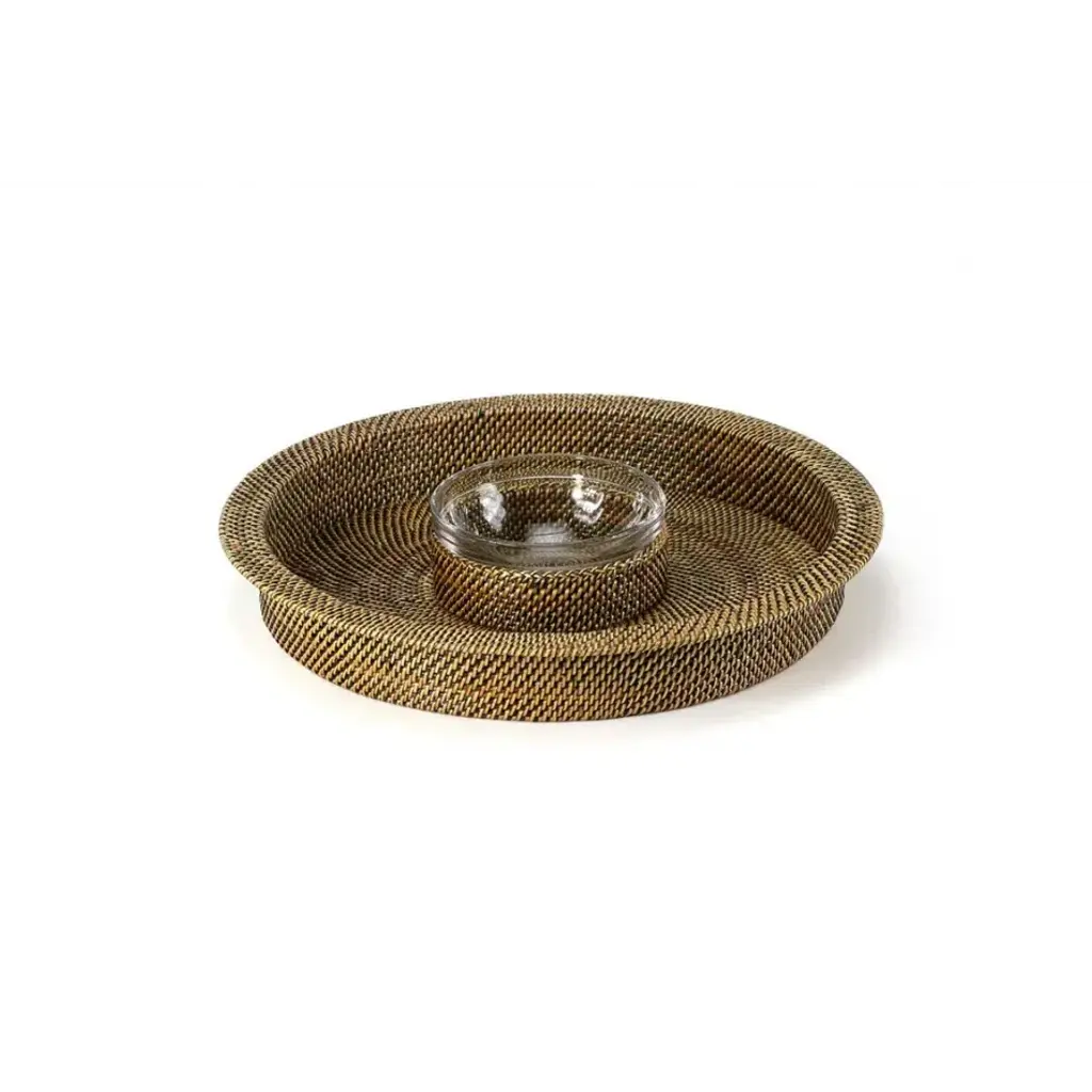Transform your table with our gorgeous handwoven Chip and Dip set. Each piece, made of sturdy exotic vines, has distinct rustic color tones that provide natural elegance to your table setting. The generous chip holder and ideal-sized middle dish for dips, paired with a 8 oz Luxurious Stoneware Ramekin handcrafted in Portugal, make this set a must-have for any entertaining needs.