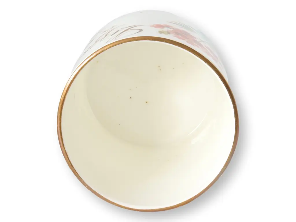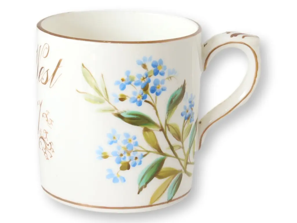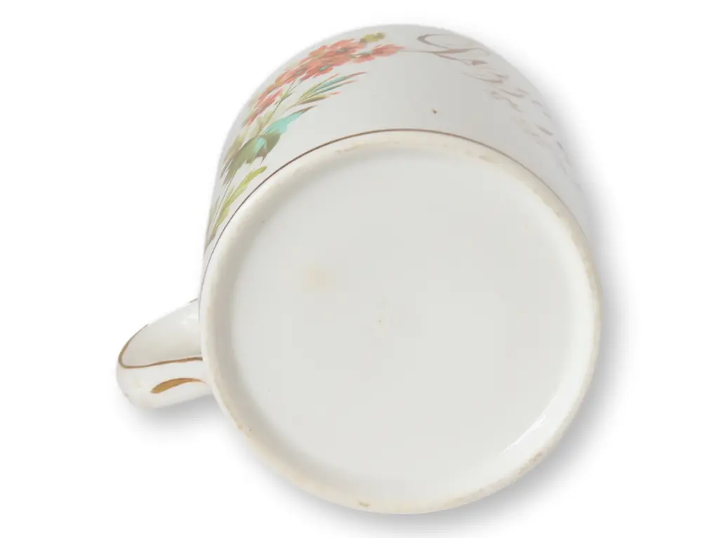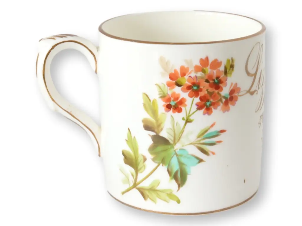This hand-painted Victorian porcelain christening mug from 1897 is a charming commemorative piece dedicated to Lizzie West. The mug is adorned with delicate floral motifs and gold accents, featuring hand-lettered script celebrating Lizzie’s birth year. Ideal for collectors of Victorian memorabilia or as a decorative accent with historical significance.