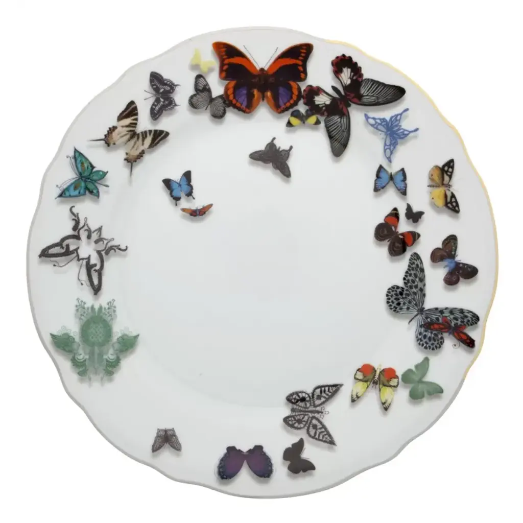 A parade of real and imaginary butterflies flying over the pieces, with notable three-dimensional effects. One of the four decorations of the Vista Alegre Christian Lacroix collection that represents the ""mix and match"" of the Christian Lacroix brand, allowing the sophisticated mixing of styles and shapes. Dinner set and decorative pieces with handmade details in gold and platinum. Lush and rich, the Butterfly Parade allows you to ""mix and match"" with the three remaining Vista Alegre Christian Lacroix decorations: Forum, Sol y Sombra and Picassiette. A collection that is luxurious and bold, fun and exquisite, blending the iconic elements of both brands. Vista Alegre is a world-renowned tabletop company and manufacturer of the largest collection of fine tableware, home decor, giftware, and hotelware in porcelain, crystal and glass in Europe. Known for its strong connection to design and culture and its tradition of working with world-renowned artists such as Christian Lacroix, Oscar de la Renta, and Karim Rashid, Vista Alegre offers a quality of excellence that appeals to a broad range of consumer tastes.