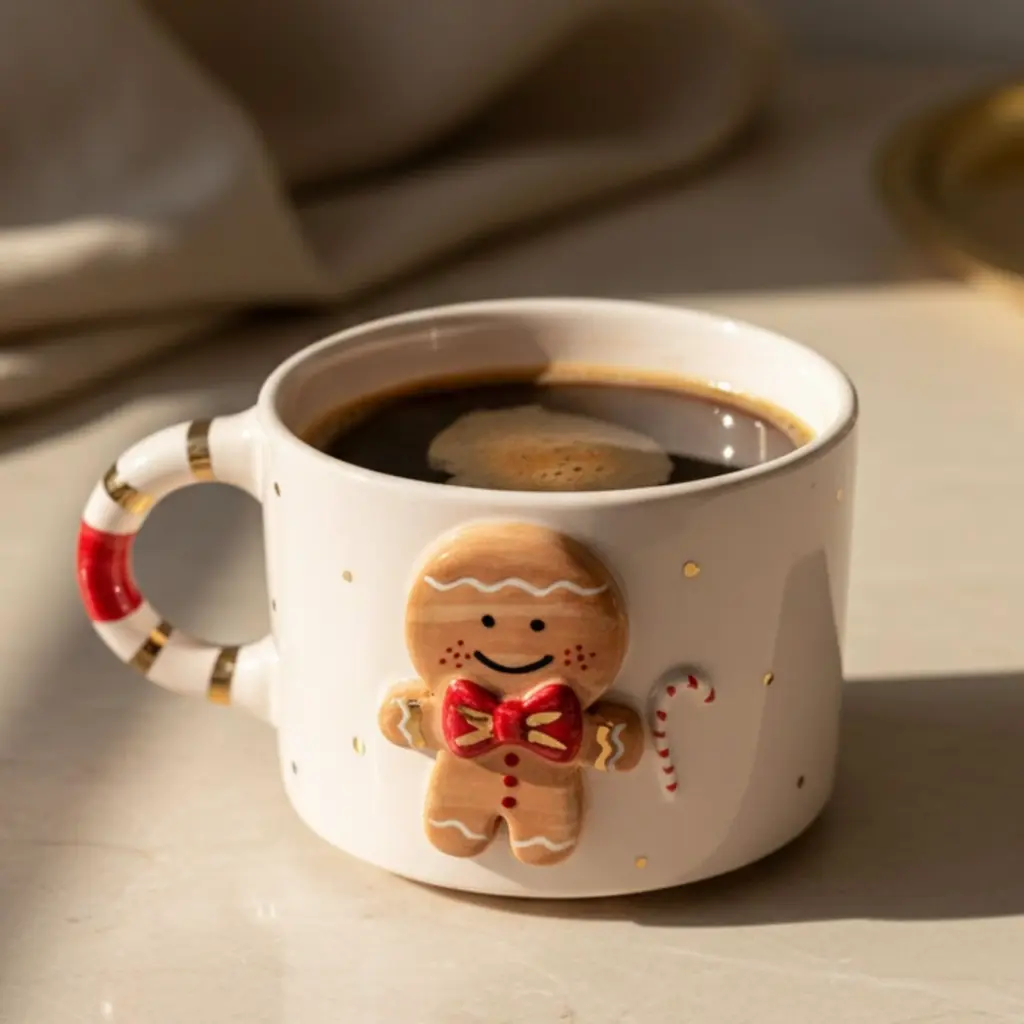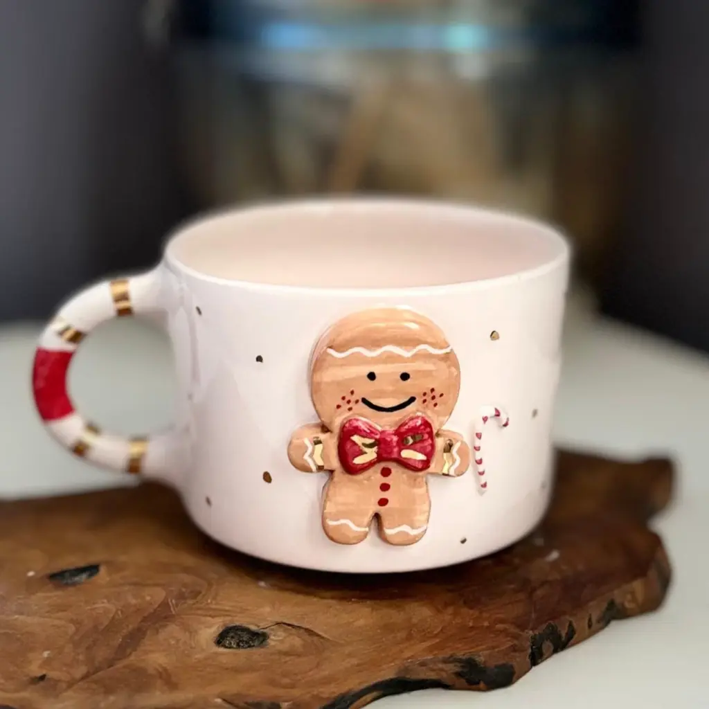 Sweeten your holiday season with this charming handcrafted ceramic mug, featuring an adorable 3D gingerbread man in a festive bow tie, accented with delicate 24ct gold detailing. The playful candy cane and warm gingerbread colors evoke nostalgic memories of holiday baking, while the candy-cane-striped handle, also highlighted with gold touches, adds a whimsical yet refined touch. Perfect for enjoying warm drinks by the fire, this delightful mug is a wonderful way to bring a smile to your seasonal sips or to gift someone a bit of festive cheer.