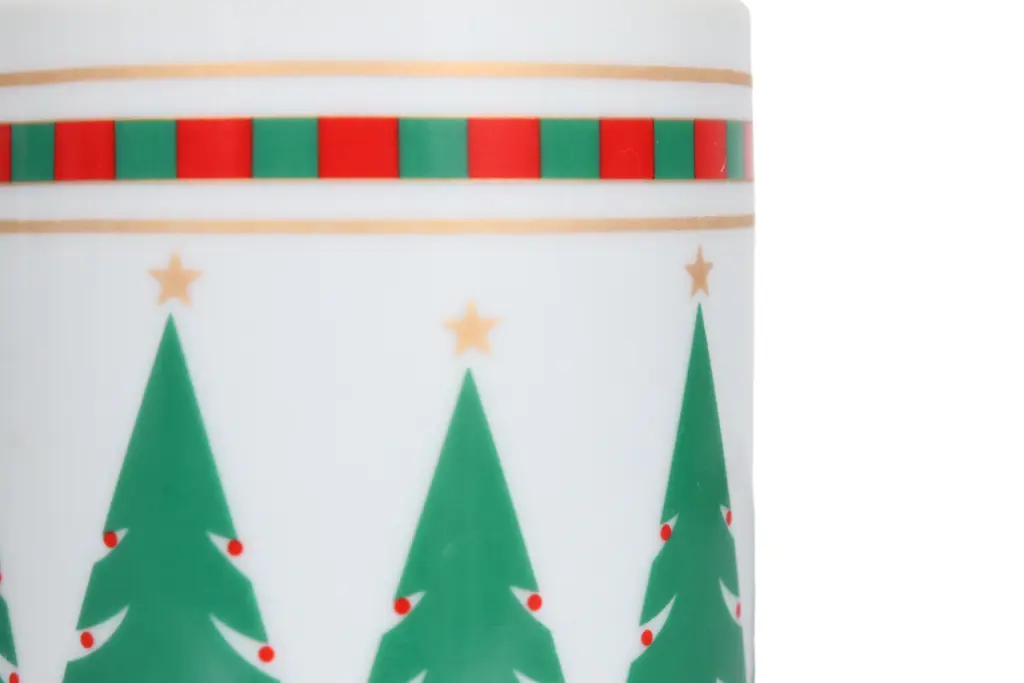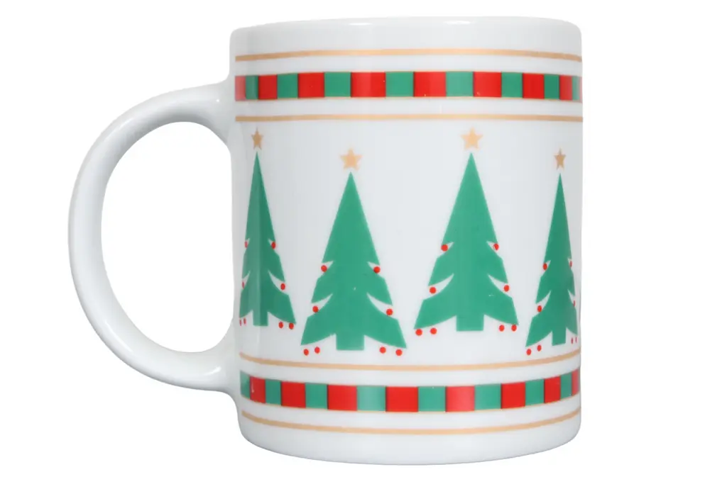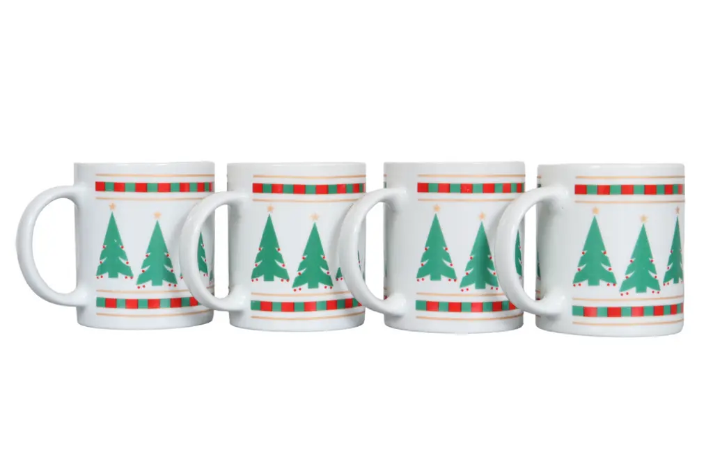 A set of four white ceramic coffee mugs. Pop art Christmas tree icons decorate the sides, framed above and below with a red, green and gold lined border. Marked underneath �����Produced for Houston Food Co”. Dimensions per mug.