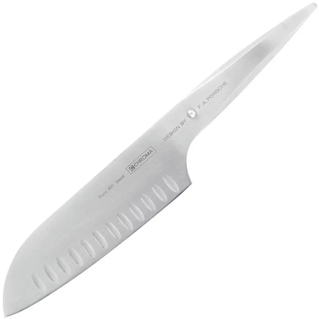 The CHROMA JAPANCHEF leaves out a lot of the fancy stuff for the sake of affordability, but keeps its excellent, ice-hardened HRC 58° steel blade, ground to sharp perfection. The Japanese geometric blade, ground to a “V” shape, makes the cnives very sharp. The CHROMA JAPANCHEF is made by a Taiwanese-run factory in China. A product worth keeping an eye on, CHROMA JAPANCHEF Cnives are the best cutters, keep an edge a very long time, and are simple and fast to sharpen using a CHROMA sharpening stone. Product Features • Ideal basic knife for restaurant chefs and students • Hand-wash • Use for cutting, not chopping Product Information • Model Number: J05 • Dimension: 16.75 x 3 x 1 inches • Item Weight: 8.5 ounces • Shipping Weight: 8.5 ounces • Origin: China