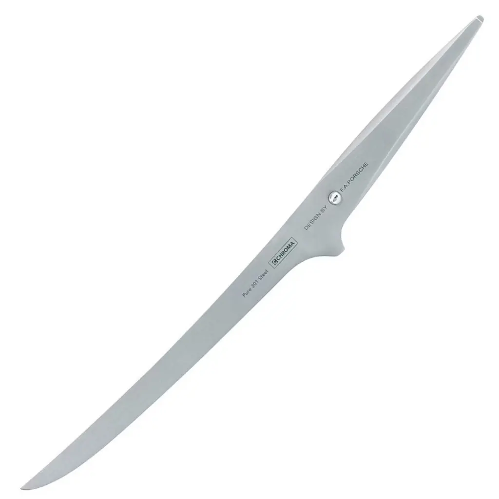 The handle of the CHROMA type 301 - Design by F.A. Porsche is constructed of stainless steel, and the blade is made of high-quality Japanese 301 steel. The blade of each knife is carefully razorsharp sharpened by the hand of a master. Product Features • An ergonomic handle - designed by F.A. Porsche working with the chef of the decade, Jörg Wörther • A metal "pearl" that clearly demarcates the end of the handle, for better control when cutting • A seamless perfection and hygienic transition from blade to handle • A special grinding method is used, so the knife stays sharp longer and is easier to sharpen • That it is beloved by famous gourmet chefs • The out of the box sharpness is one of the best in the industry Product Information • Model Number : P21 • Dimension : 15.2 x 3 x 2 inches • Item Weight : 1.23 pounds • Shipping Weight : 1.23 pounds • Origin : Imported