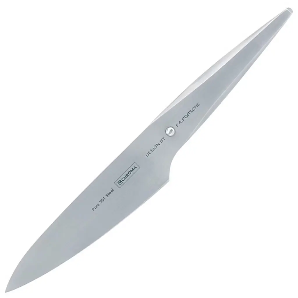 A sharp and ergonomic knife is perhaps the most important and certainly the most favorite tool of a Chef, regardless if he is a professional or a hobbyist. Japanese knives have achieved global recognition for their quality, as the Japanese hold a long tradition in metallurgy. The Japanese metallurgists have elevated the forging and sharpening of the blade into a form of art for hundreds of years, since the era of the notorious Katana swords. On the other hand, Europeans and Americans also make excellent knives, often characterized by superior ergonomics and design, but rarely distinguished for the hardness and sharpness of their blade. The type 301 knife series by Chroma bridges the gap between Japanese tradition and the European design. Chroma type 301 cutlery are designed by F.A. Porsche and they stand out for their unique design and their practical function. Porsche Design worked closely with chef of the decade, Jörg Wörther, in order to develop the final shape of the handle, which is optimized for maximum usability. The result is a precision cutting tool. Each knife is carefully weighted to ensure perfect balance in the hand and in combination with the highly ergonomic handle, it feels like an extension of the user's hand Product Information • Model Number : P02 • Dimension : 15.2 x 3 x 2 inches • Item Weight : 1.34 pounds • Shipping Weight : 1.41 pounds • Origin : Imported