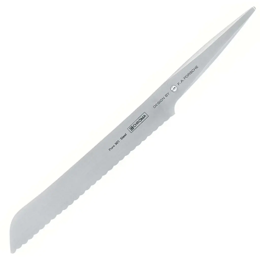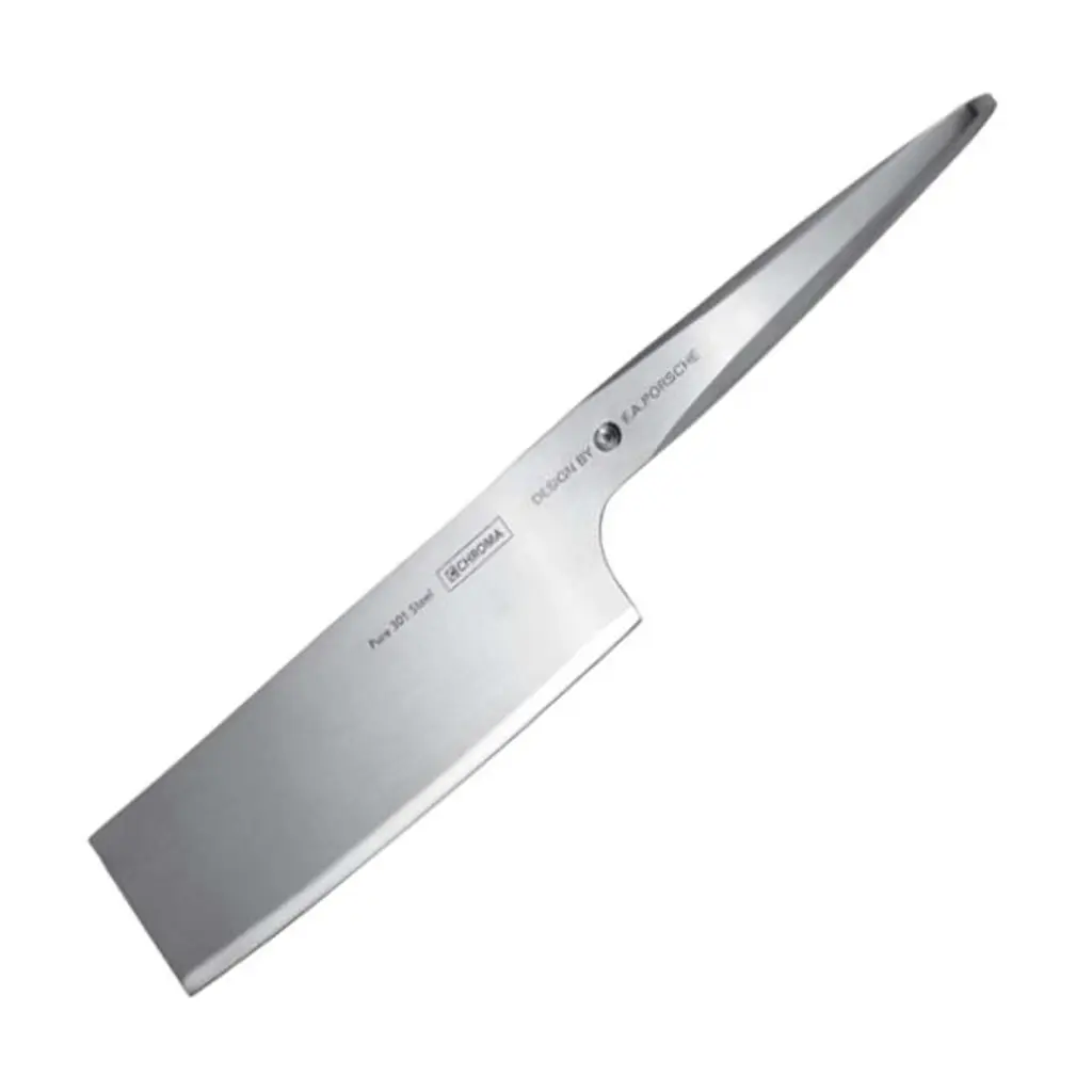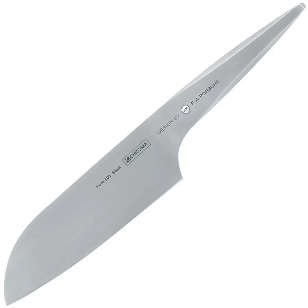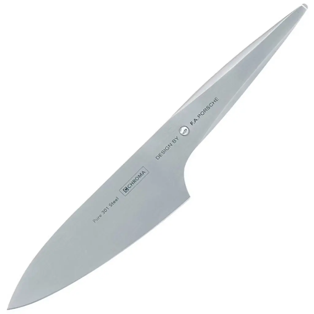 The handle of the CHROMA type 301 - Design by F.A. Porsche is constructed of stainless steel, and the blade is made of high-quality Japanese 301 steel. The blade of each knife is carefully razorsharp sharpened by the hand of a master. Product Features • An ergonomic handle - designed by F.A. Porsche working with the chef of the decade, Jörg Wörther • A metal "pearl" that clearly demarcates the end of the handle, for better control when cutting • A seamless perfection and hygienic transition from blade to handle • A special grinding method is used, so the knife stays sharp longer and is easier to sharpen • That it is beloved by famous gourmet chefs • The out of the box sharpness is one of the best in the industry Product Information • Model Number : P18 • Dimension : 15.2 x 2.9 x 2 inches • Item Weight : 1.23 pounds • Shipping Weight : 1.46 pounds • Origin : Imported