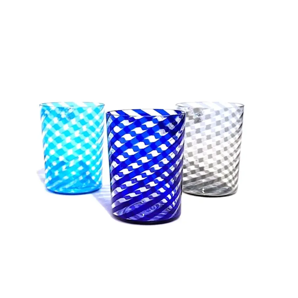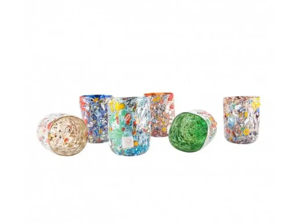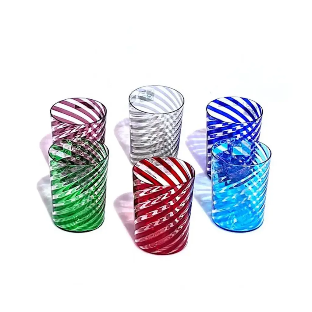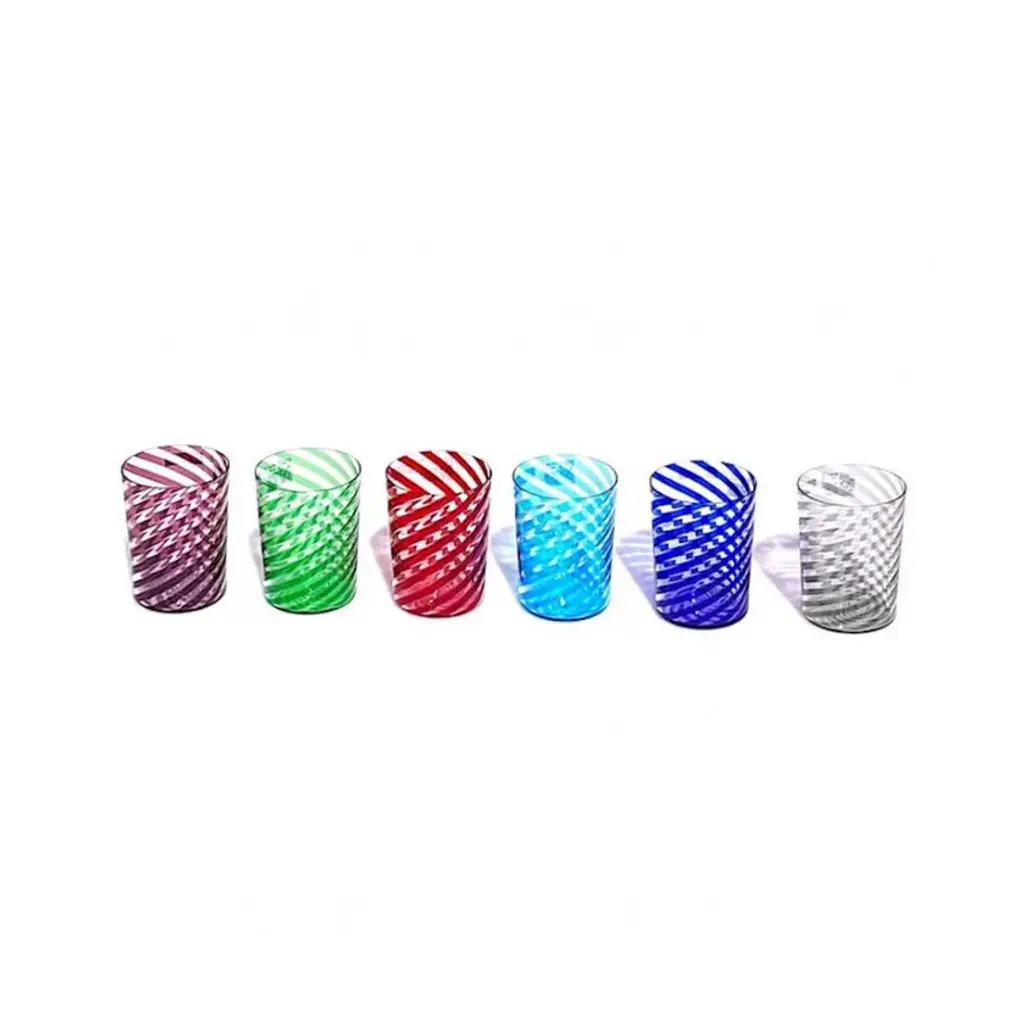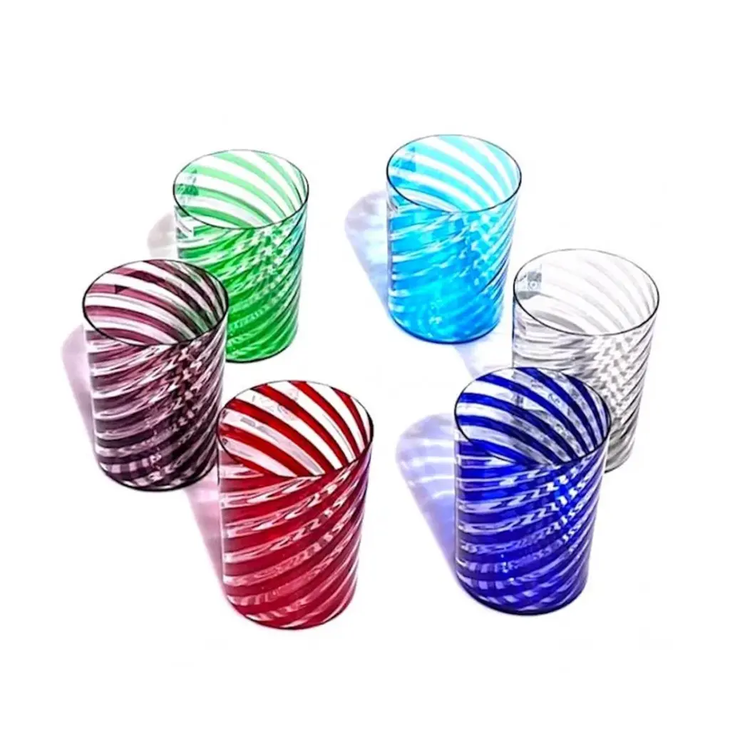 CIRIL is a seautiful set of 6 tumblers with rainbow twisted colored stripes. Let your guest speechless with them.Whether you have a classic home décor or a more modern one, whether you need colorful glasses to give a creative twist to your dining room or you are looking for a more sophisticated option to add an elegant touch to your dining table, you will certainly love our Murano glass tumblers, also known as “goti”. These precious Murano glasses are carefully handmade by expert glassmakers in the heart of the Venetian lagoon, they are unique collectible items to impress all your guests! All products are handcrafted and prime production quality. Insubstantial variations in shape, size, colour, small imperfections in the glass are not considered defects; they are inevitable and are typical of manual production of the glass and characterize handcrafted production.