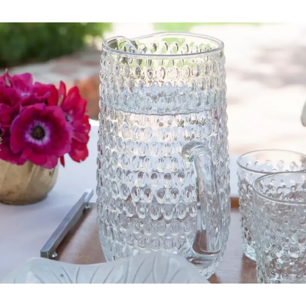 The cylindrical Claire evokes the servingware of eras past—a modern update on a vintage classic. Oval-shaped beads add texture to the pitcher while a smooth handle makes for a sturdy hold. Material: Hand blown glass. Blue Pheasant's products are handmade with care by artisans using natural materials. They are not mass produced, so variation between products should be expected, and this is why we love them! It is these irregularities that makes Blue Pheasant what it is—a special brand whose collections are distinctly handmade, full of charm and originality you’ll never find in machine-made products.