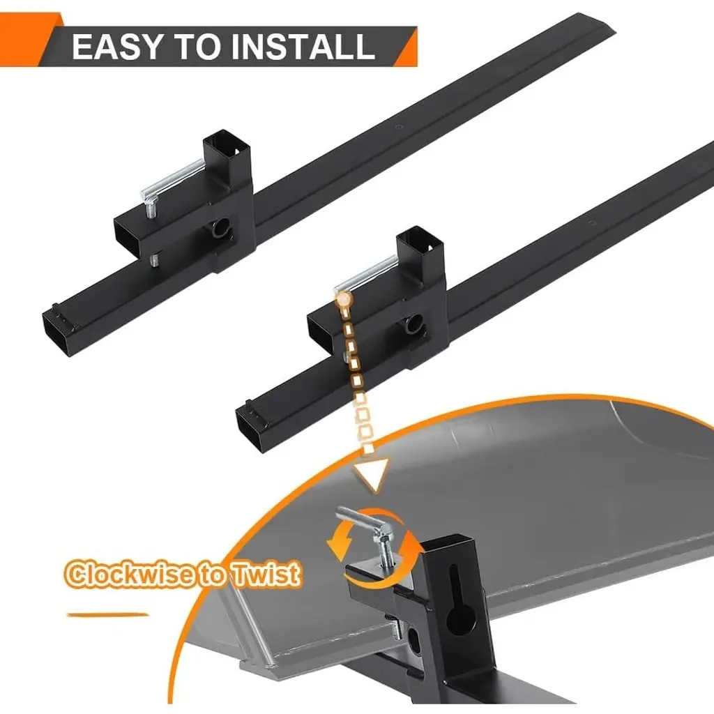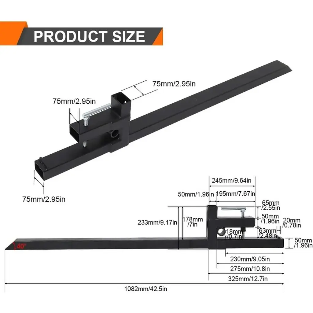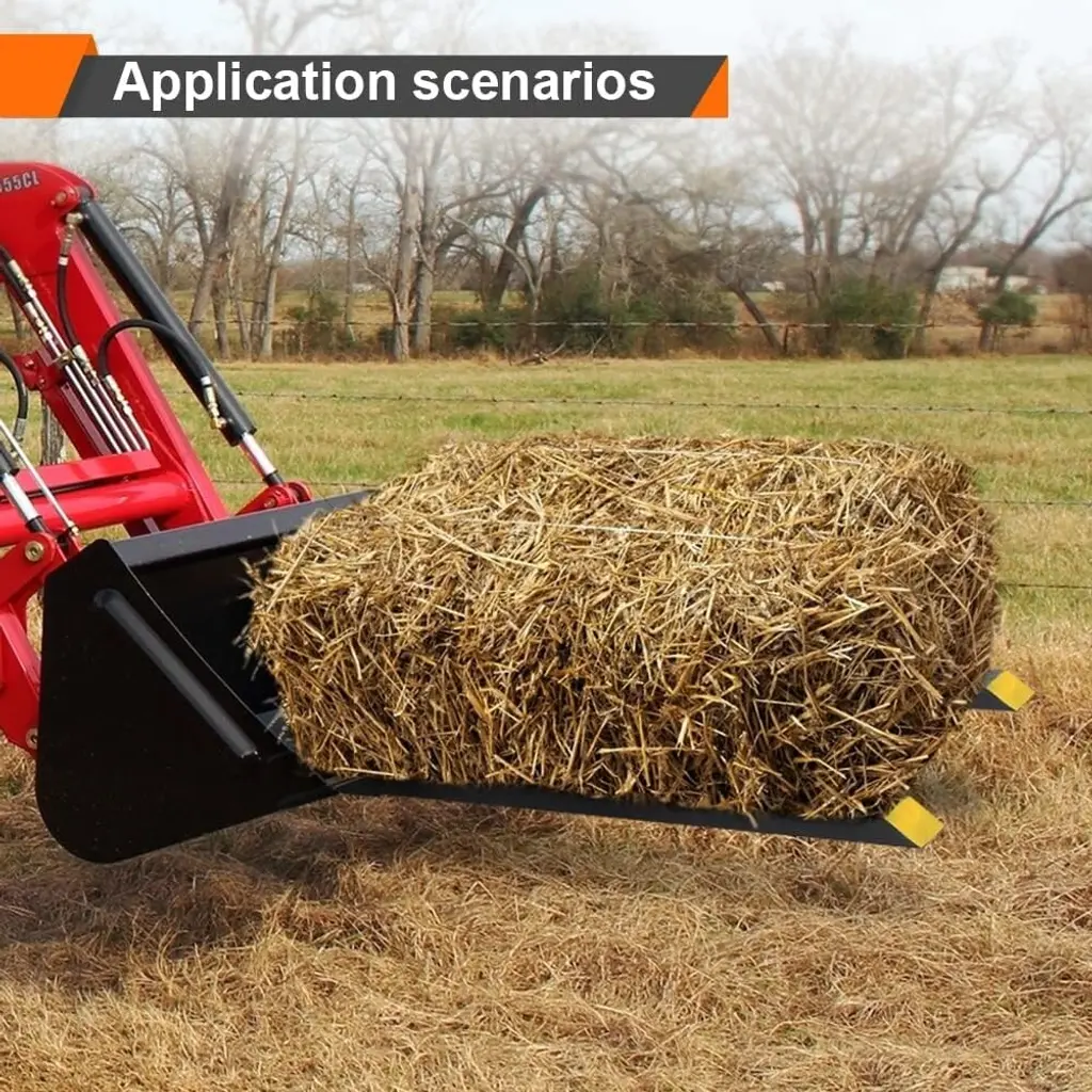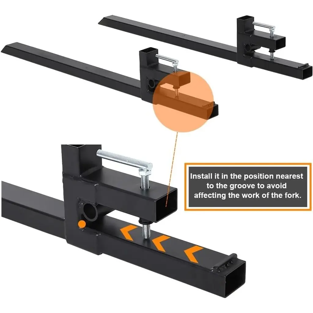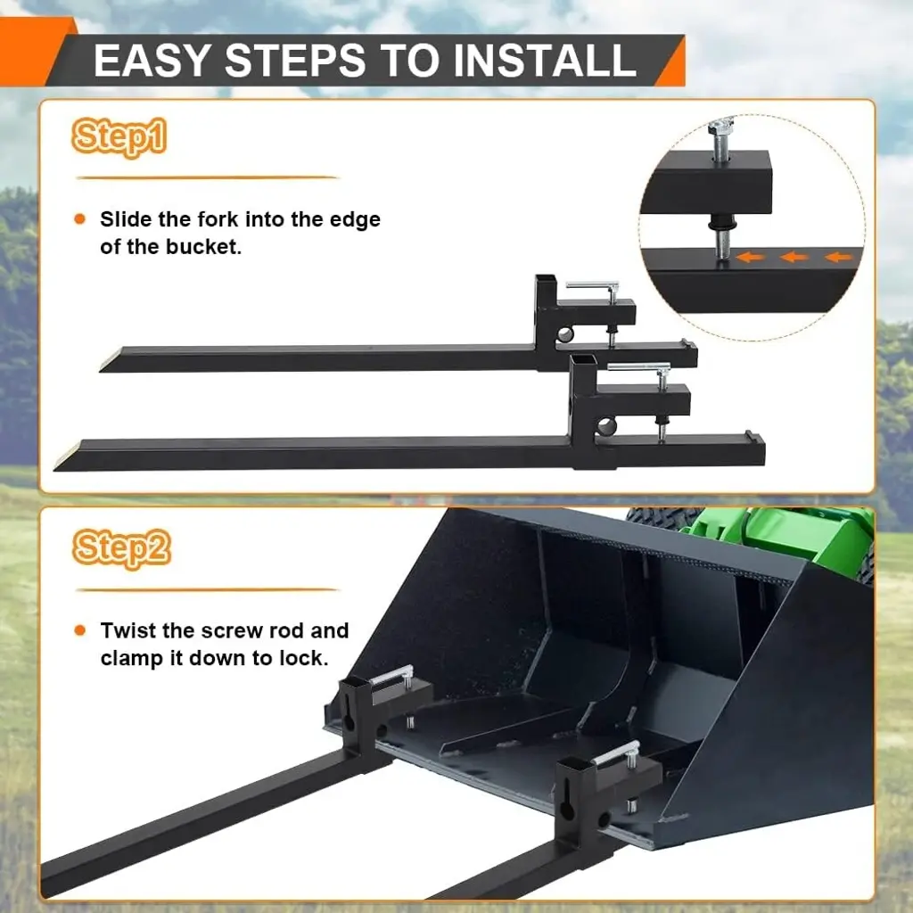 HEAVY-DUTY STEEL CONSTRUCTION: Made with ultra-strong Q235B Steel, durable and reliable. Reliable welded steel adopted by our clamp-on bucket forks is rust-resistant. Thick and rectangular tube walls add stability.LARGE LOADING CAPACITY: Working Capacity: 1500 lbs/4000 lbs. These heavy-duty pallet forks can carry loads of up to 1500 lbs/4000 lbs, so you can carry a wide variety of items. Attention: Please choose the right pallet fork according to your tractor's bearing capacity and place the loads evenly at the back position during use.SECURITY & THOUGHTFUL DESIGN: We designed the chain holes and protection slots. Use chain holes to ensure a secure lift heavy objects. Rollback protection slots will keep you and your machinery safe.SUITABLE FOR MOST TRACTORS: These pallet forks feature a universal design that is compatible with most lawn tractors, loaders, and mowers. Whether you own a New Holland, Kubota, Ford, or another make, these pallet forks will easily clamp on. With this tractor pallet fork, your skid steer will turn into a multipurpose machine and you will be able to finish a lot of farm work within a short time.EASY INSTALLATION & VERSATILE: It's easy to install, simply slide the fork over the cutting edge of the bucket and clamp it down to lock. It can haul logs, lumber and firewood, move fence posts, hay bales, clear debris and brush. The versatility of our pallet forks is endless.(With adjustable stabilizer bar Applicable only to products with adjustable stabilizer bar: Features with adjustable stabilizer bar to prevent your forks from spreading apart conveniently, you can get your desired distance when lifting debris. The stabilizer bar can be adjusted from 19" to 29"/ 24" to 40"/ 27" to 42.5".)Please read the contents of the product carefully before you purchase. Some products have adjustable stabilizer bars, some don't, please choose the correct size.Description:Name: Pallet ForksColor: BlackSize Optional: 43" L 1500 LB Capacity 43" L 1500 LB Capacity with Adjustable Stabilizer Bar 60" L 1500 LB Capacity with Adjustable Stabilizer Bar 60" L 4000 LB Capacity 60" L 4000 LB Capacity with Adjustable Stabilizer Bar Packing list: 1 x Pallet Forks 1 x Adjustable Stabilizer Bar(some no) 1 x English instructionsNote:Due to manual measurement, please allow 1-3 cm error, thank youDue to screen and other objective reasons, there may be a certain color difference, please understand.