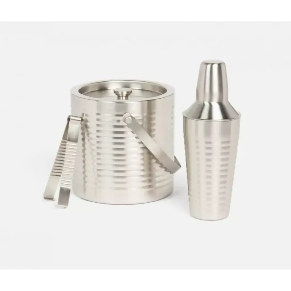 Set of ice bucket and cocktail shaker in matte nickel finish with undulating design. Blue Pheasant's products are handmade with care by artisans using natural materials. They are not mass produced, so variation between products should be expected, and this is why we love them! It is these irregularities that makes Blue Pheasant what it is—a special brand whose collections are distinctly handmade, full of charm and originality you’ll never find in machine-made products.