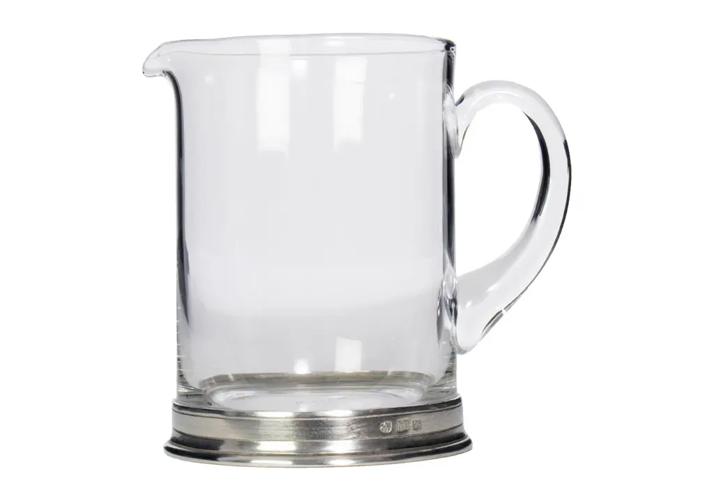 Pebbled glass is what differentiates this pitcher. It is bordered with a fine gold rim for accentuated elegance. Fill it with the beverage of your choice, and, if it's a colored beverage, it will show through nicely the lustrous glass. It’s a beloved piece that will enhance every table. It washes beautifully.