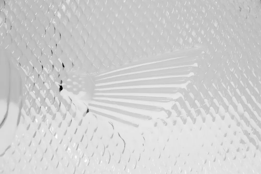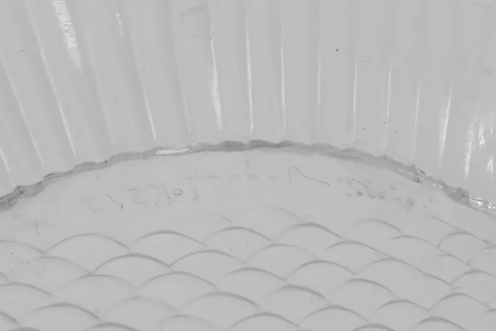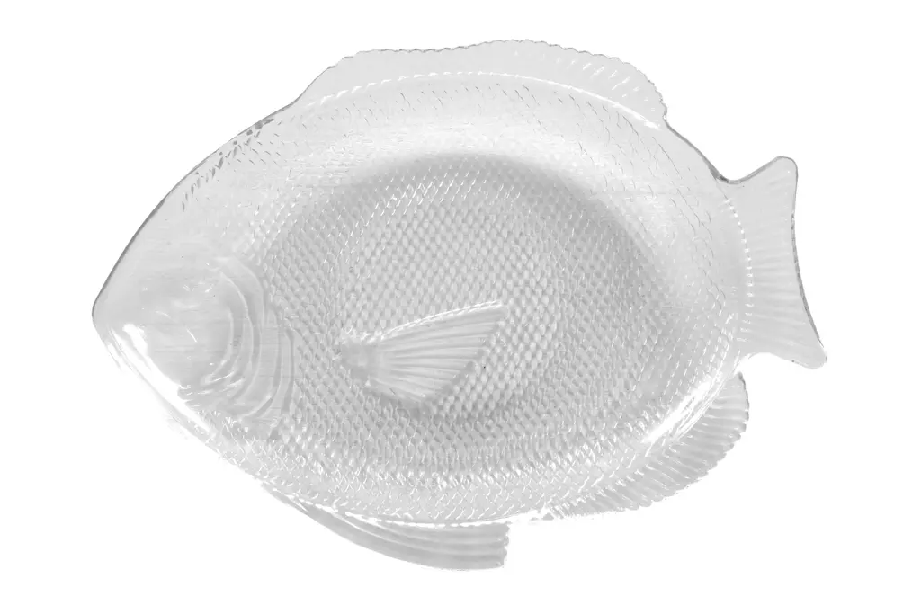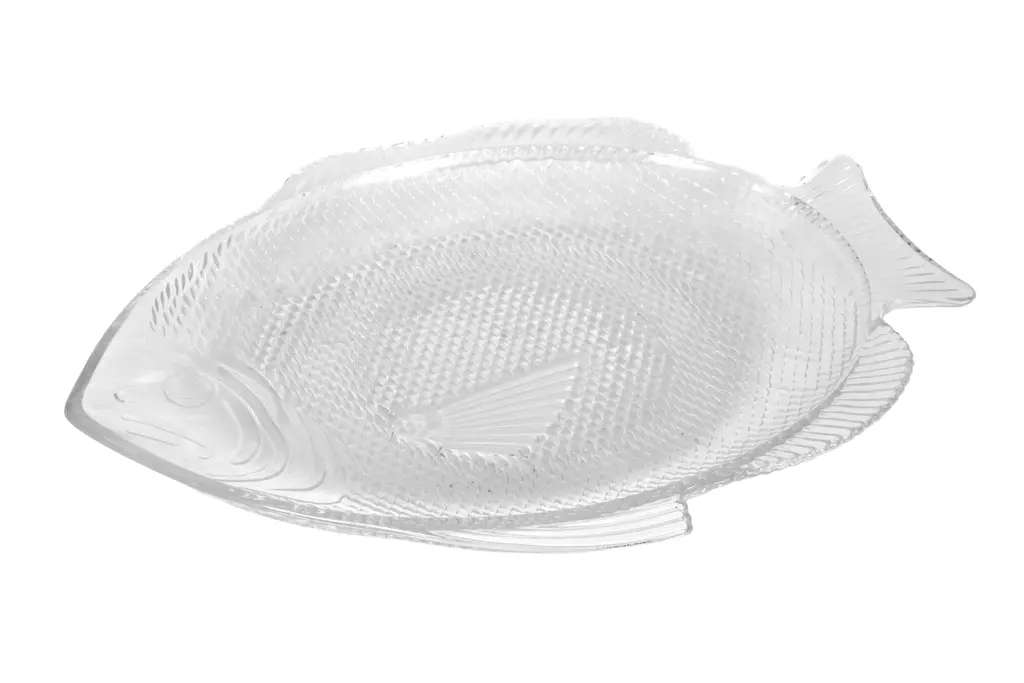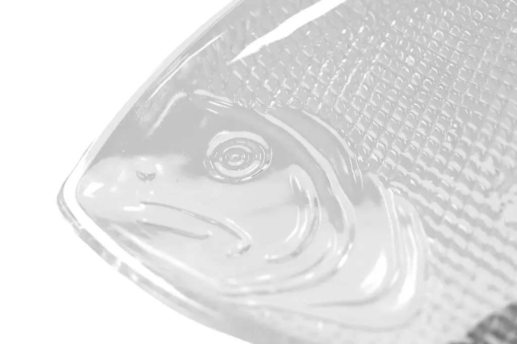 A clear glass platter shaped like a fish. Pressed with scales and lines to show details such as eyes and mouth on the head and lines to show the fins. Marked underneath ‘Oven Proof USA’.