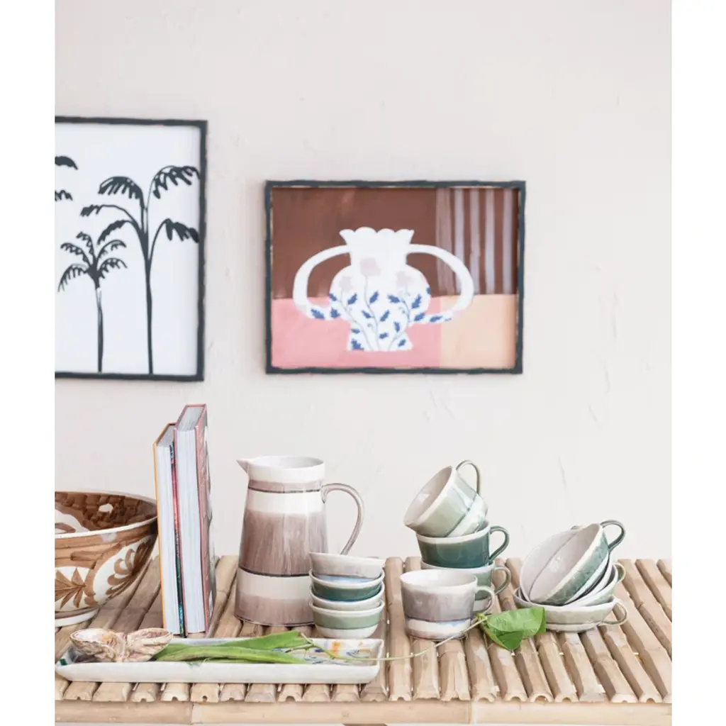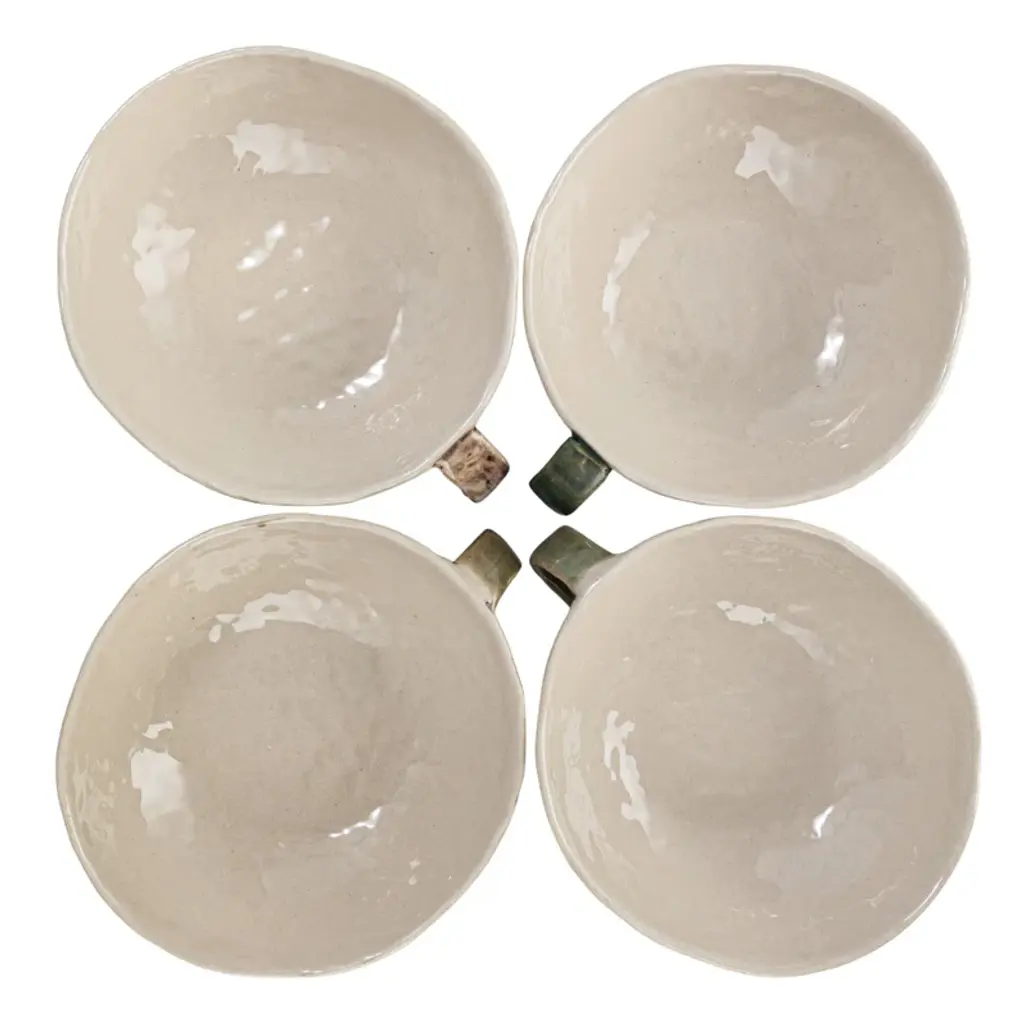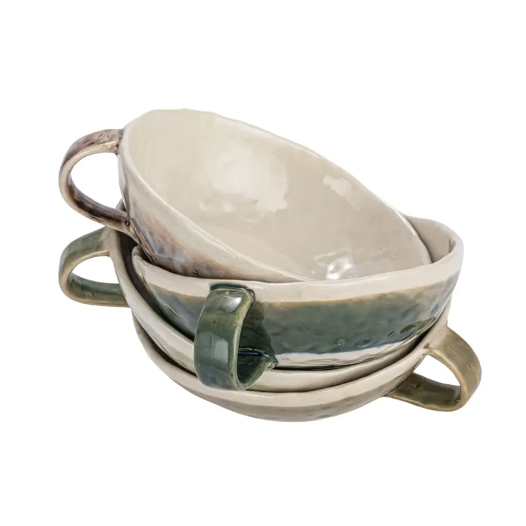 This stoneware mug set features four round, low-height mugs with a smooth surface and sturdy handle. Each mug has a different color, adding personality and contrast. This set is suitable for various room styles, including farmhouse, French country, Scandinavian, lodge, and coastal. It can be used for coffee, tea, hot chocolate, or soup in various settings. The mugs are made of durable stoneware, easy to clean, and have a glazed finish. The set measures 5.25 inches in diameter, 1.75 inches in height, and has an 8 oz. capacity. The mug set is a versatile and cozy accessory that enhances the drinking experience and ambiance.