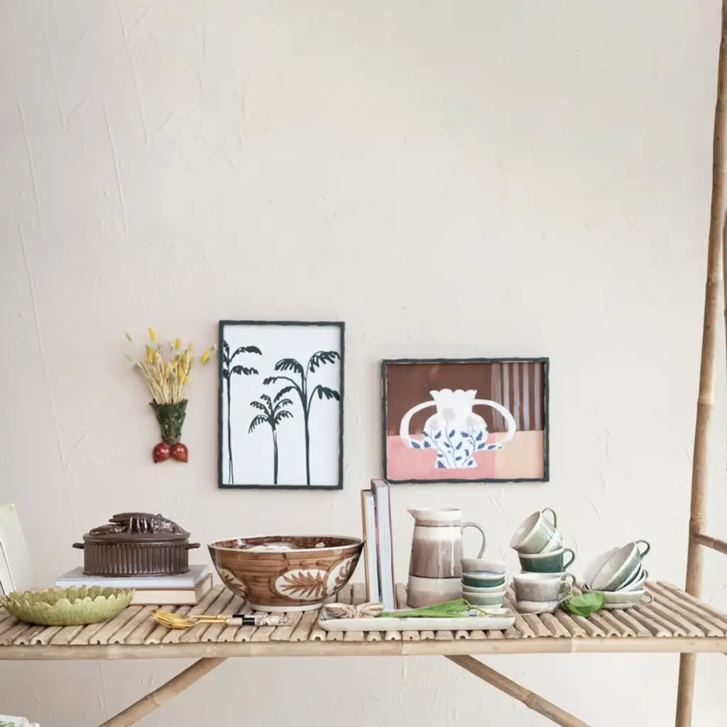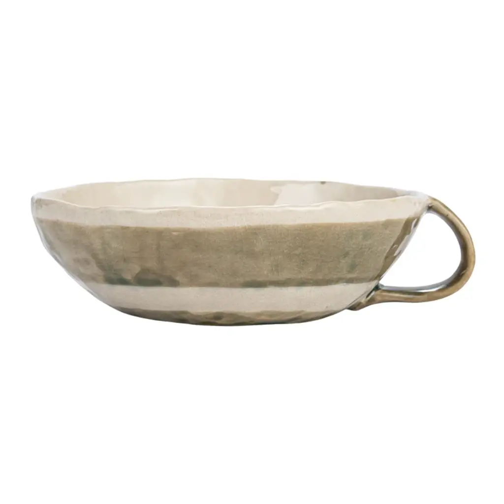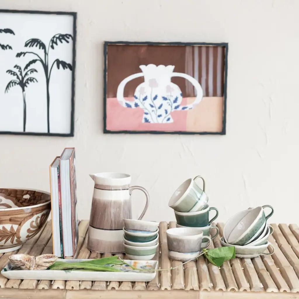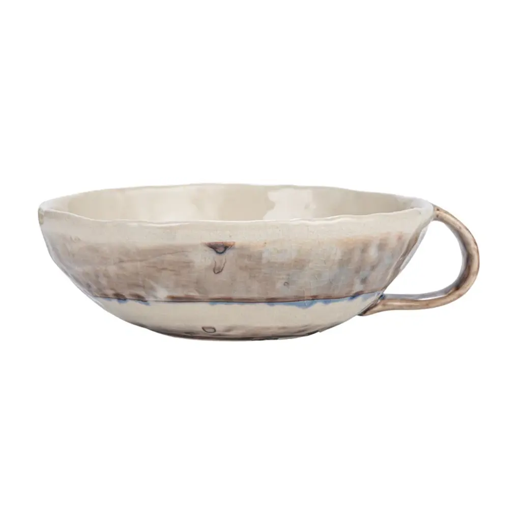 This stoneware mug set features four round, low-height mugs with a smooth surface and sturdy handle. Each mug has a different color, adding personality and contrast. This set is suitable for various room styles, including farmhouse, French country, Scandinavian, lodge, and coastal. It can be used for coffee, tea, hot chocolate, or soup in various settings. The mugs are made of durable stoneware, easy to clean, and have a glazed finish. The set measures 5.25 inches in diameter, 1.75 inches in height, and has an 8 oz. capacity. The mug set is a versatile and cozy accessory that enhances the drinking experience and ambiance.
