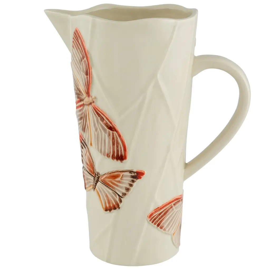 Meticulously hand-painted butterflies adorn this earthenware pitcher, calling attention to its scalloped rim and textural details. Part of supermodel Claudia Schiffer's collaboration with Bordallo Pinheiro, the pitcher was crafted using time-honored artisanal techniques.