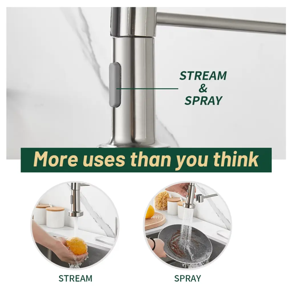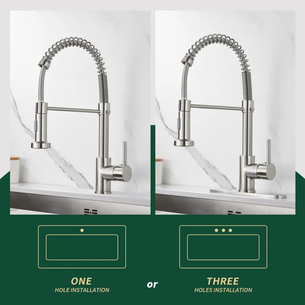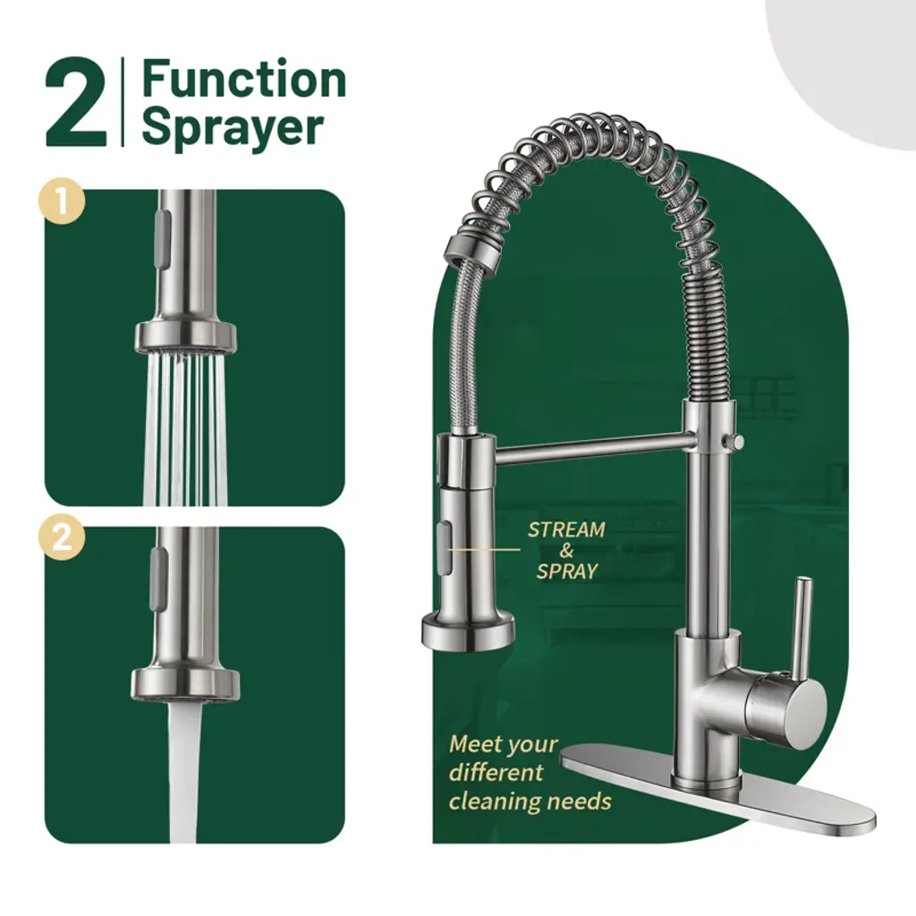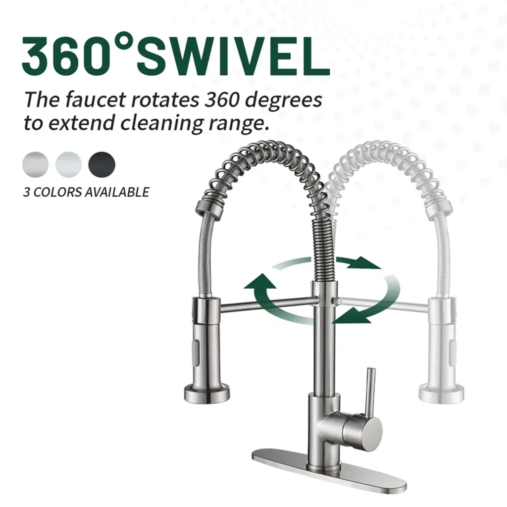 The spring-loaded pull-down kitchen faucet has a 360° swivel spout for a larger spout area and greater flexibility. Dual-function spray head with stream and spray has soft rubber nozzles that allow you to wipe away mineral build-up for easy maintenance. The high curved shape of the swan neck is not only stylish and elegant, but also makes it easier to clean and fill tall, large pots and pans. Its sleek design and high-quality construction is a kitchen must-have. Crafted from high-quality SUS 304 stainless steel, this faucet boasts a non-drip ceramic valve cartridge, ensuring both safety and durability. Simply press the button on the spout to switch between the two spray modes (stream/spray). Elevate your kitchen with the high arc design, breaking through spatial limitations to effortlessly clean even the bulkiest pots and pans in deep sinks. The spring is flexible and pulls the spout down somewhat. Our kitchen faucet surface undergoes a special treatment to resist corrosion, peeling and discoloration, a simple wipe with a damp cloth restores its clear and immaculate appearance, adding a touch of sophistication to your kitchen. Our faucets come with a deck plate, so whether you have a one-hole or three-hole sink, our faucets will match your sink perfectly and add beauty to your kitchen. Get peace of mind with our two-year warranty and installation instructions, ensuring a hassle-free experience.