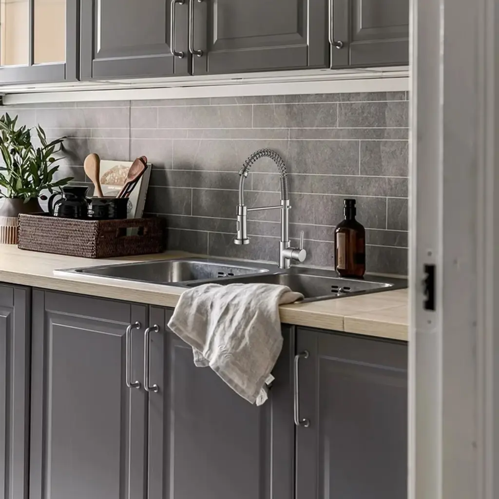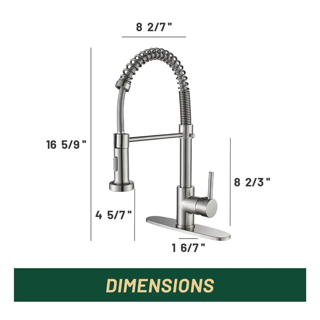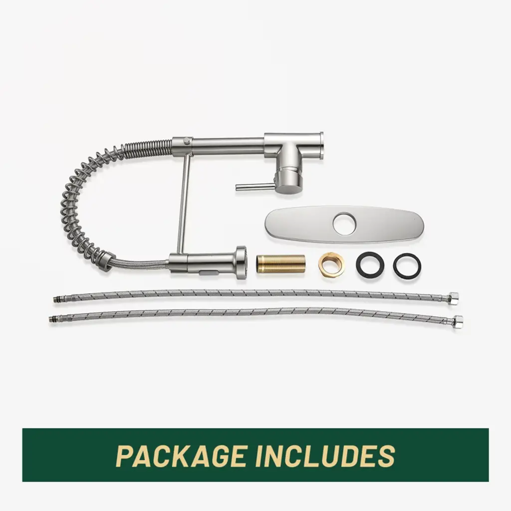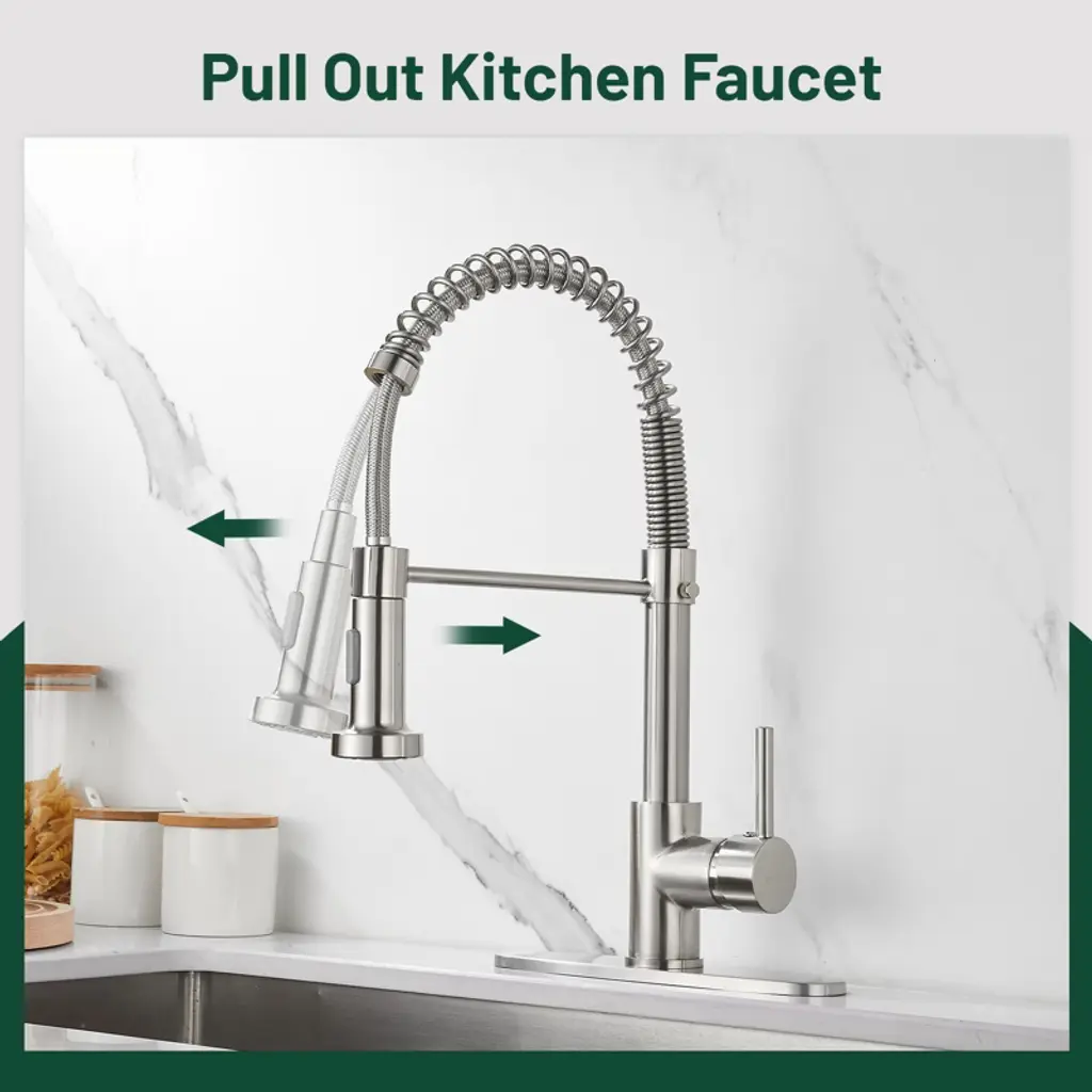 The spring-loaded pull-down kitchen faucet has a 360° swivel spout for a larger spout area and greater flexibility. Dual-function spray head with stream and spray has soft rubber nozzles that allow you to wipe away mineral build-up for easy maintenance. The high curved shape of the swan neck is not only stylish and elegant, but also makes it easier to clean and fill tall, large pots and pans. Its sleek design and high-quality construction is a kitchen must-have. Crafted from high-quality SUS 304 stainless steel, this faucet boasts a non-drip ceramic valve cartridge, ensuring both safety and durability. Simply press the button on the spout to switch between the two spray modes (stream/spray). Elevate your kitchen with the high arc design, breaking through spatial limitations to effortlessly clean even the bulkiest pots and pans in deep sinks. The spring is flexible and pulls the spout down somewhat. Our kitchen faucet surface undergoes a special treatment to resist corrosion, peeling and discoloration, a simple wipe with a damp cloth restores its clear and immaculate appearance, adding a touch of sophistication to your kitchen. Our faucets come with a deck plate, so whether you have a one-hole or three-hole sink, our faucets will match your sink perfectly and add beauty to your kitchen. Get peace of mind with our two-year warranty and installation instructions, ensuring a hassle-free experience.