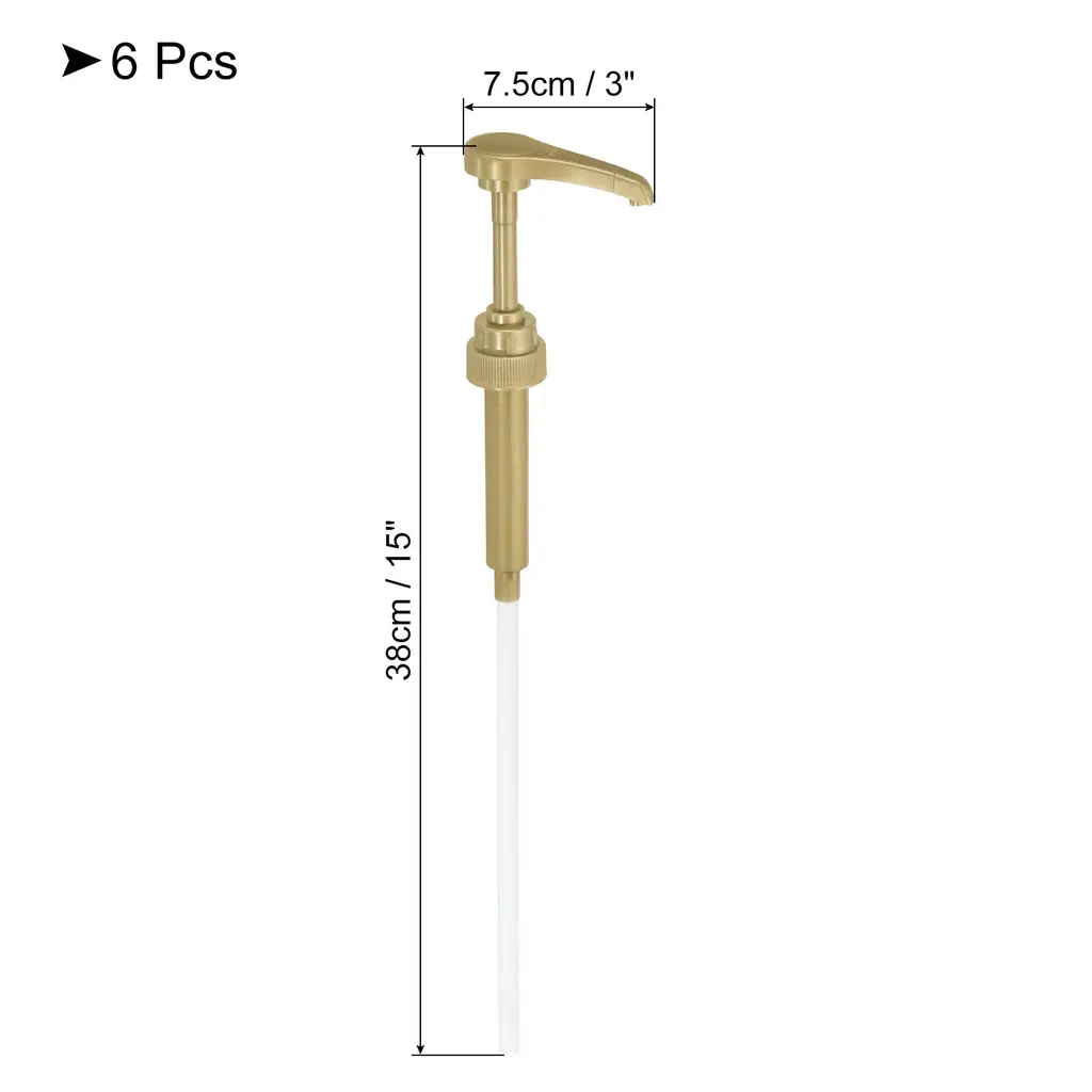 Syrup pumps are widely used at home, coffee bars, soda bars, or self-serve condiment stations.Specification:Material: PPColor: BlackSize: 38 cm(L) x 7.5 cm(W)/ 15 inch x 3 inchPackage Included: 6pcs x Syrup PumpAdvantage:Our coffee syrup pumps are made of PP material, sturdy, durable, direct contact with food liquid, and safe to use.Simply place the pump on top of your coffee syrup and press the trigger to dispense the syrup into your cup.The length of the dip tube can extend to the bottom of the bottle, making sure the syrup remains at the bottom.The syrup pump is designed to fit a variety of bottles, preventing dripping, leakage, and other spills.They will help you make a cup of delicious tea, coffee, cocktails, soda, snow cones, and so on.Note: Please allow 1-2 mm differences due to manual measurement. Due to the difference between different monitors, picture may not reflect the actual color of the item