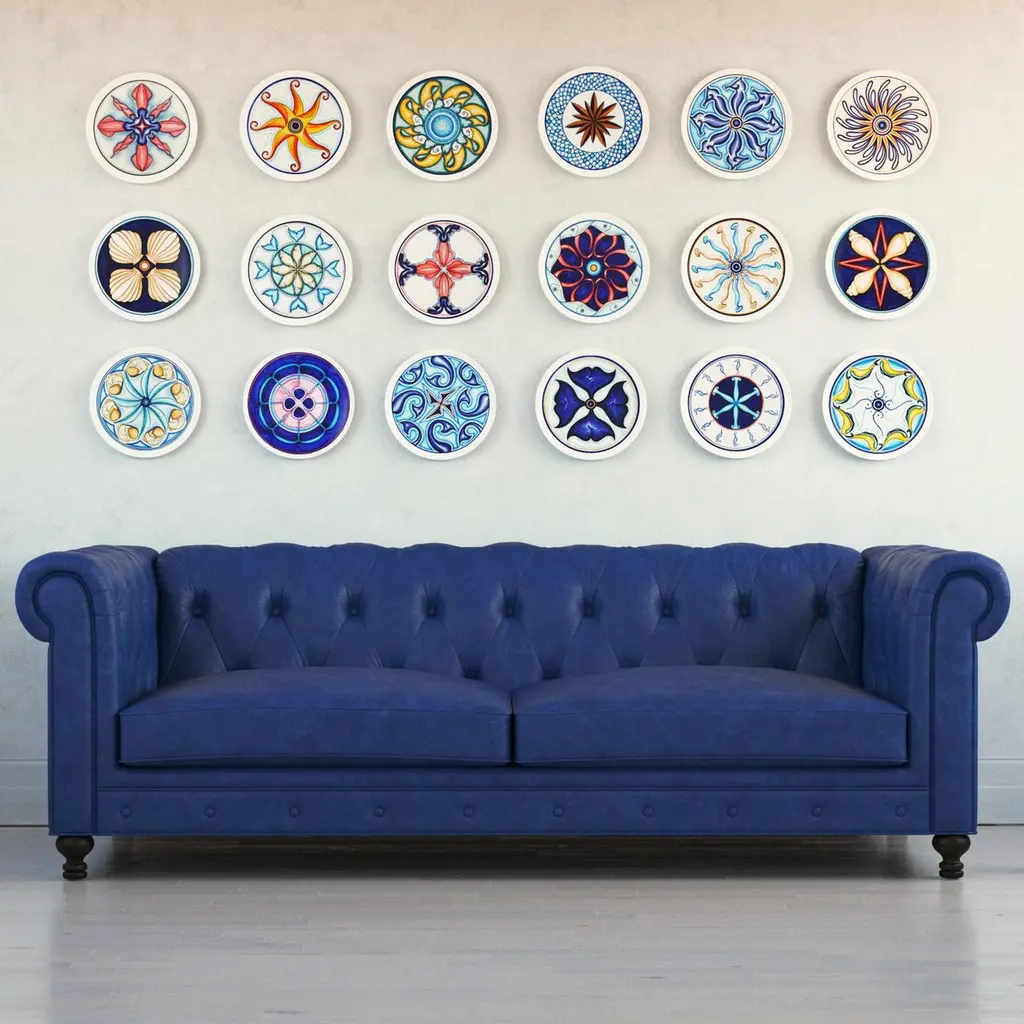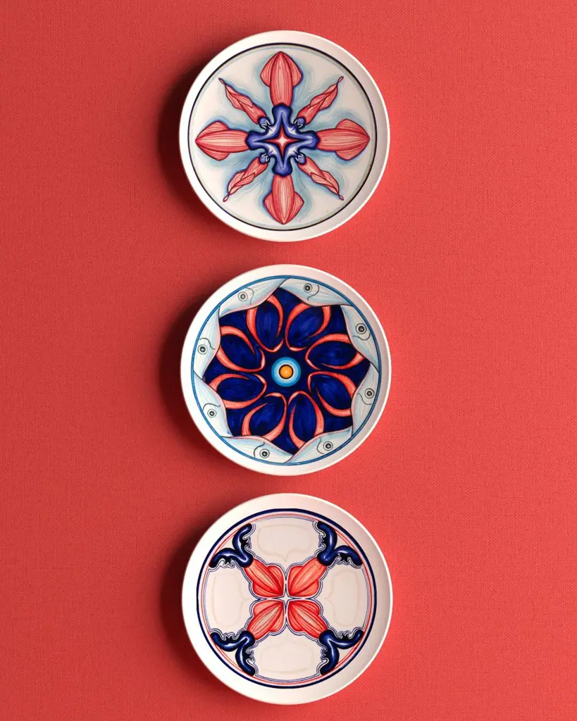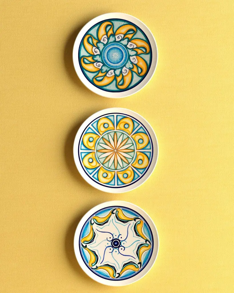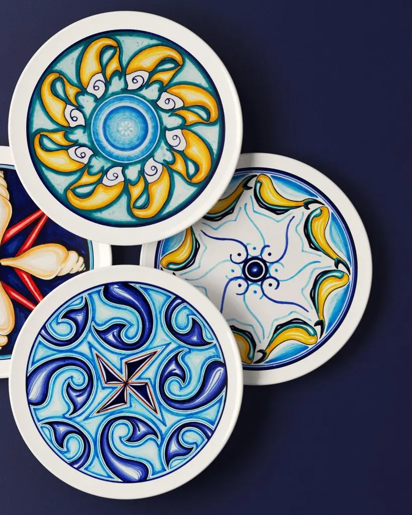 Finely hand-painted, this set of 28 decorative red glazed clay plates is inspired by the Sicilian legend of Colapesce, a half-man, half-fish creature who chose to save his beloved island by giving up his own life. Fish and sea creatures come to life in a dance of vibrant colors: yellow, blue, coral and a thousand shades that evoke the Mediterranean seabed. The meticulous attention to detail and freshness of design make this collection a masterful example of authentic Italian-made craftsmanship.