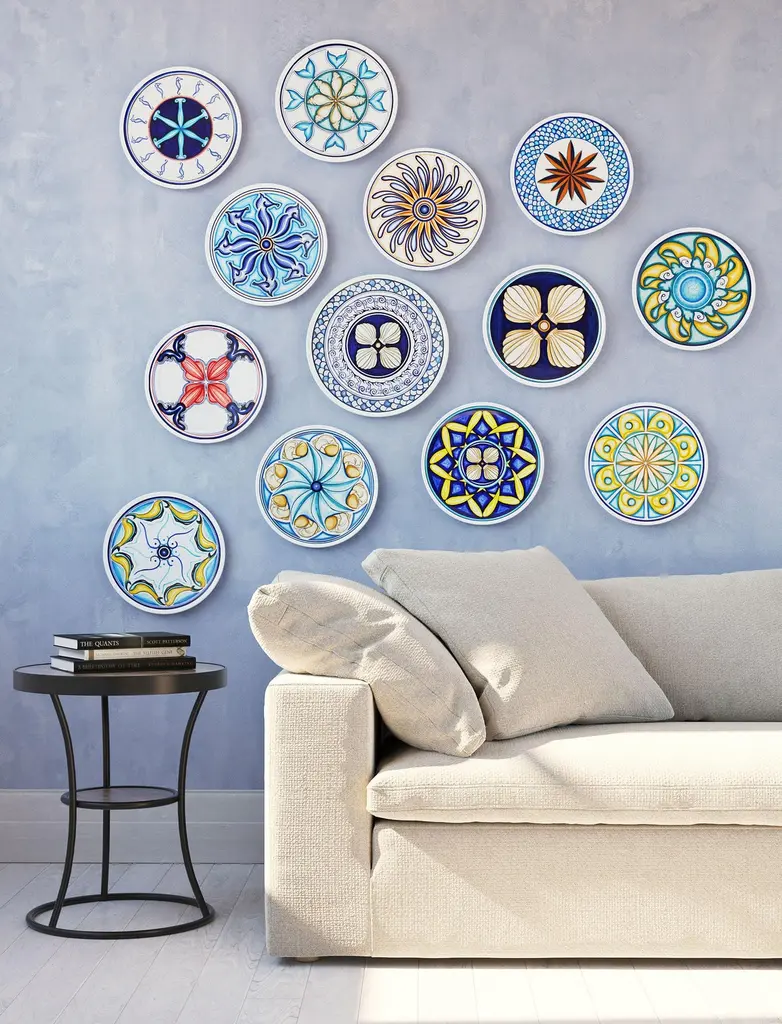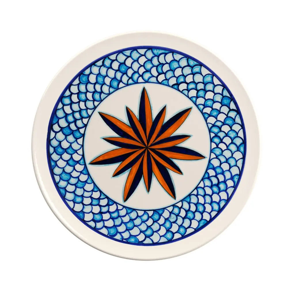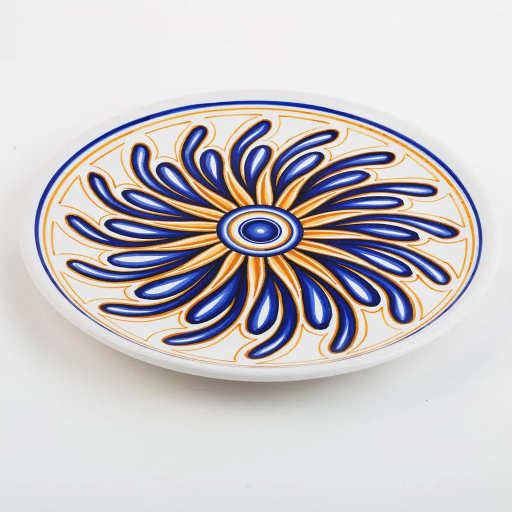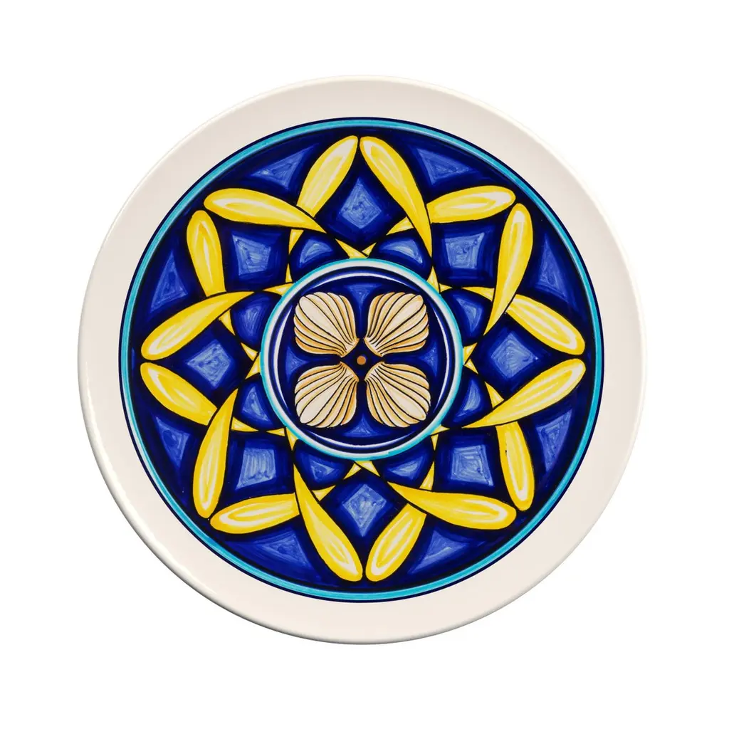 Finely hand-painted, this set of four decorative red clay plates is inspired by the Sicilian legend of Colapesce, a creature half man and half fish who chose to save his beloved island at the cost of his own life. Fish and sea creatures bring this collection to life with the brilliance of dozens of shades in yellow, blue, and coral.