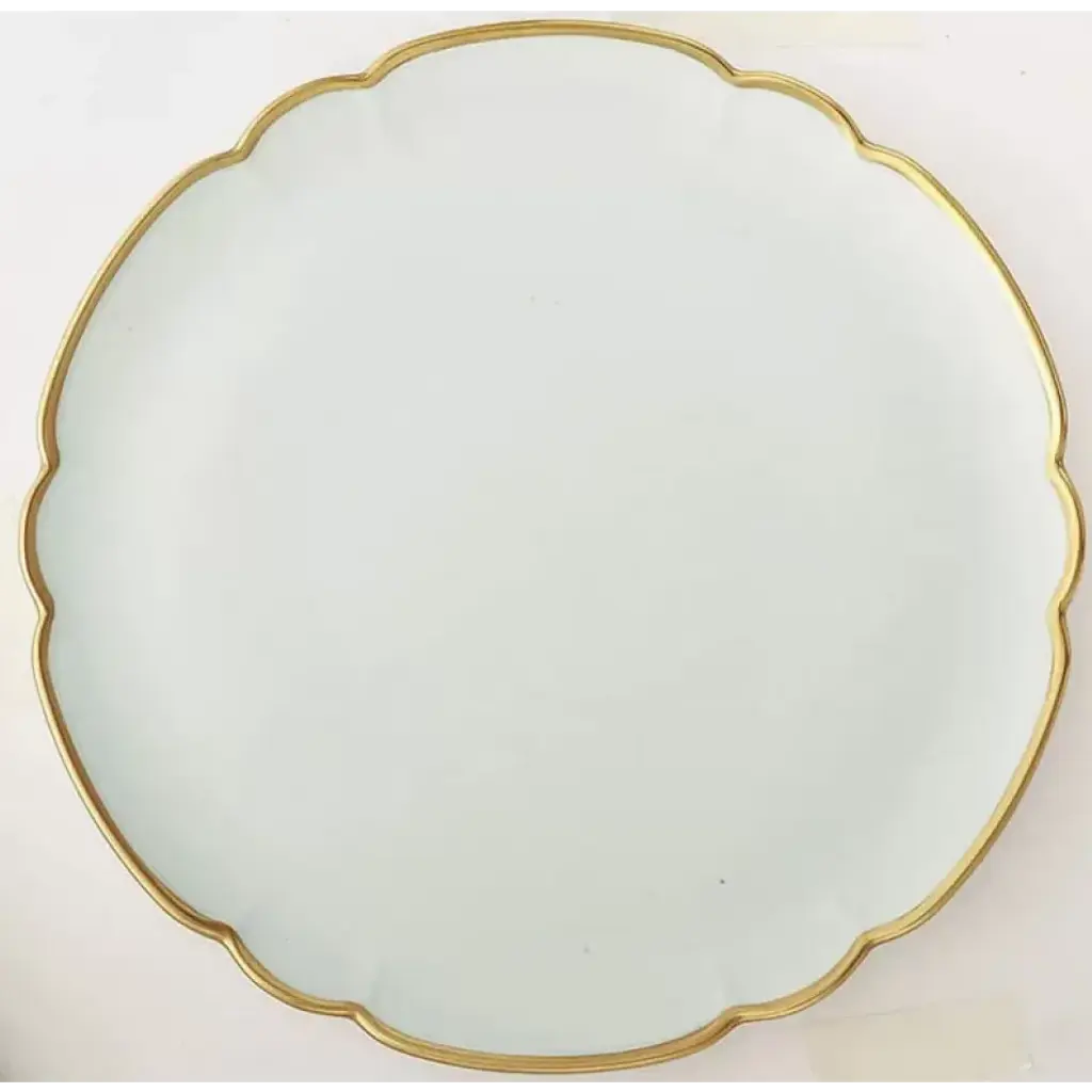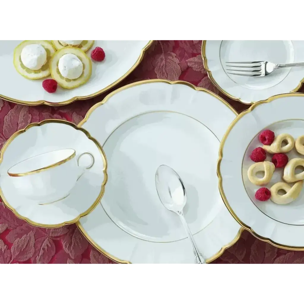 Classic and elegant, this pattern features a stunning gold edge on a simple white background. Five-piece place setting includes dinner plate, salad plate, bread/butter plate, teacup, and saucer. In 1924, Robert Haviland collaborated with Camille Parlon to form Robert Haviland and C. Parlon. Robert Haviland was from a family with a long history in the porcelain business and was able to maintain the quality that his family was known for. The company produces its fine porcelain in Limoges, a French town well known for this coveted material.