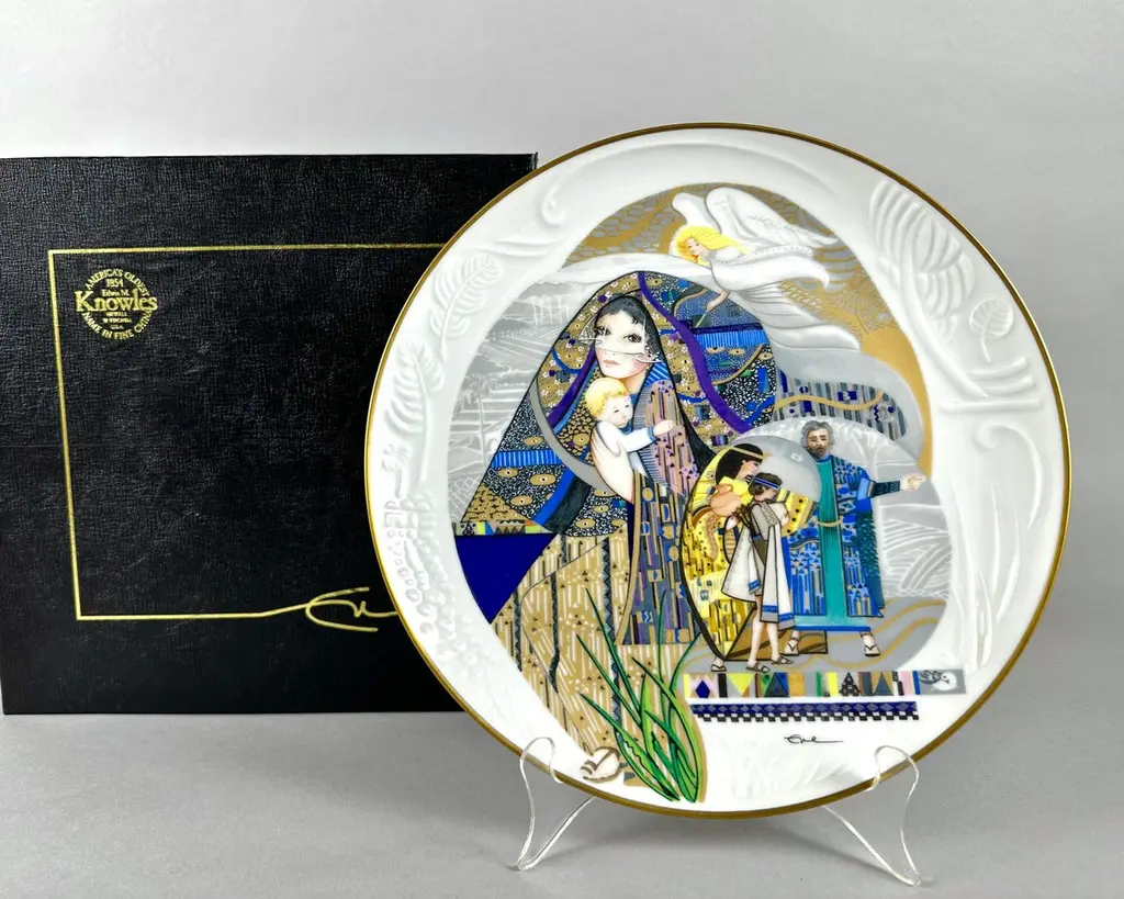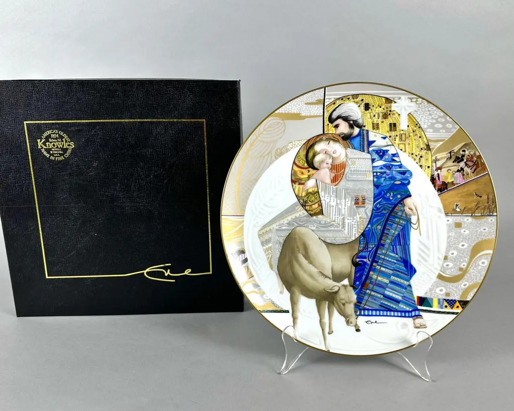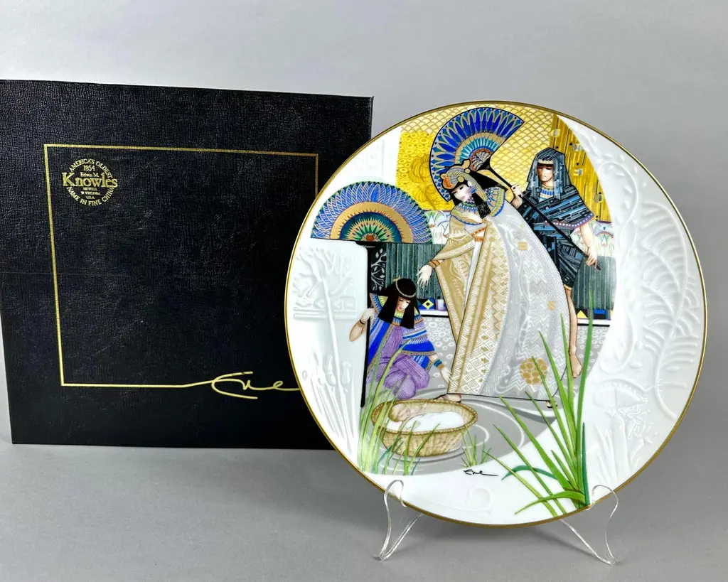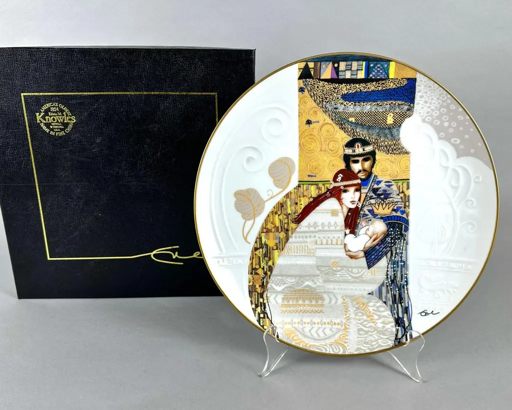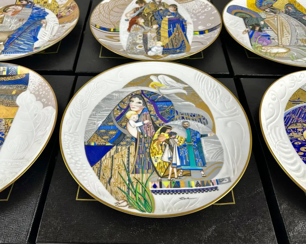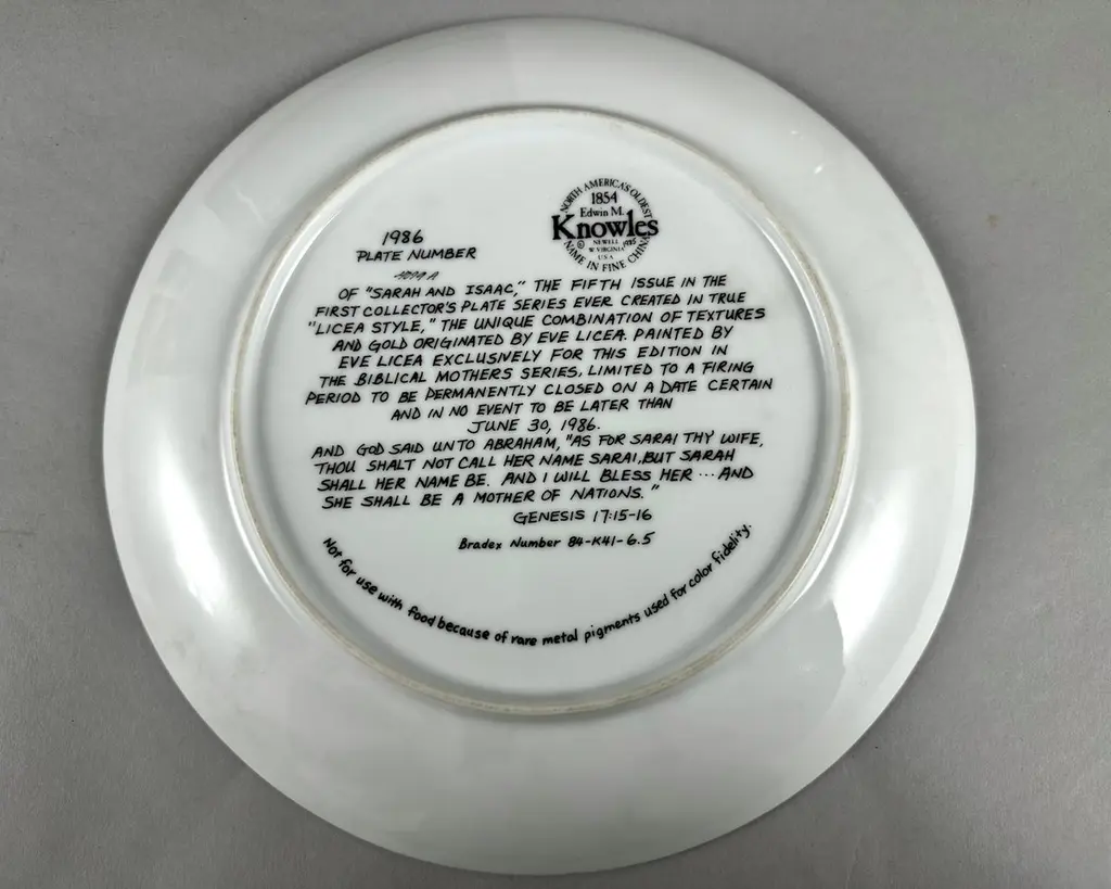 A collection of Edwin M. Knowles fine china collector numbered plates from The Biblical Mothers Series by the artist Eve Licea.Made in the original Licea Style technique, combining voluminous texture and gold patterns.Certificate of Authenticity and Booklet Included.Comes In Original Boxes. 1. "SARAH AND ISAAC" 2. "REBEKAH, JACOB AND ESAU" 3. "BATHSHEBA AND SOLOMON” 4. "THE PHARAOH'S DAUGHTER AND MOSES" 5. "THE JUDGMENT OF SOLOMON" 6. "MARY AND JESUS”Licea Style Is A Unique Combination Of Textures And Gold Originated By Eve Licea.The Edwin M. Knowles Company, with a history dating back to 1854, was one of the largest ceramics companies at the turn of the 19th and 20th centuries and was responsible for many of the inventions that revolutionized American tableware manufacturing. The company ceased operations at the end of 1962, thanks to which all the items it produced today are unique and prized by collectors.Dimensions:Diameter: 10.3 inch - 26.5 cm. The plates and the boxes are in excellent condition.
