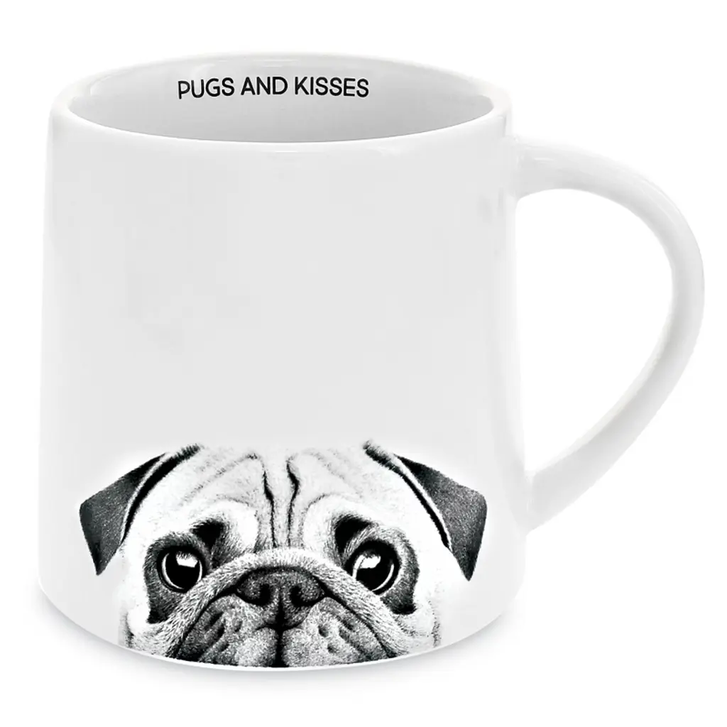 This Adorable Pug, Peeking Up From The Bottom Of The Mug, Is Here To Remind You That Every Day Is A Little Brighter With A Smile And Maybe A Wagging Tail! The White Mug Features A Black And White Pug At The Bottom And Reads, "Pugs And Kisses" On The Inside Of The Rim. Holds 17 Oz. Microwave And Dishwasher Safe. Stoneware. 5"L X 4"W X 3"H.