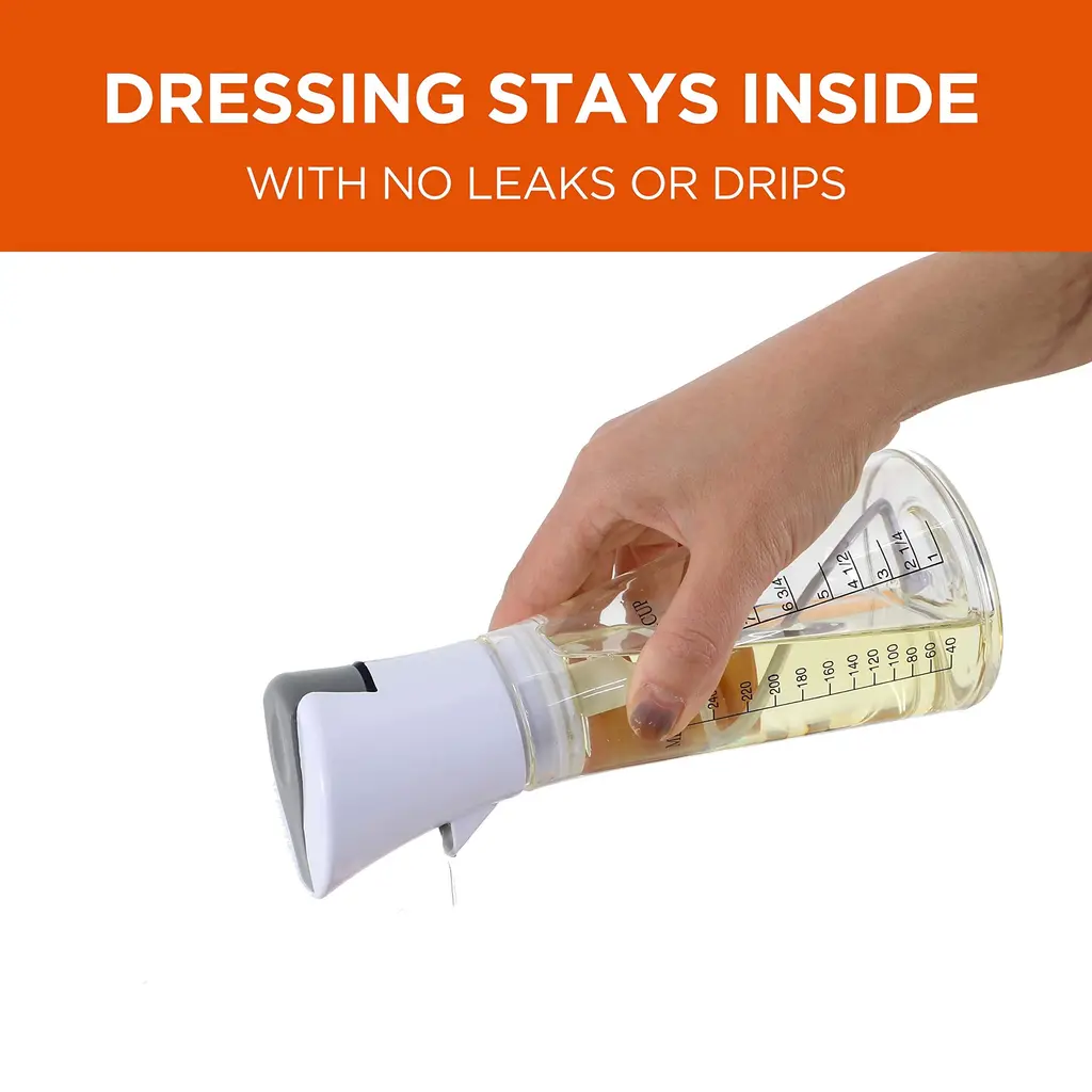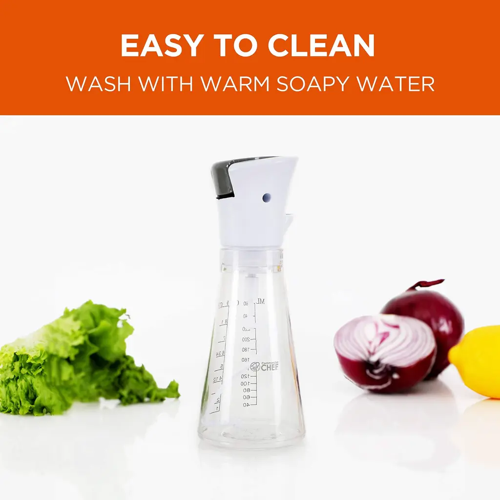 This COMMERCIAL CHEF mixer bottle is perfect for homemade dressings for delicious and fresh salads. What's better than a fresh batch of homemade ranch, blue cheese, vinaigrette salad dressing, and even oil and vinegar? This oil container (2.95" x 2.95" x 7.87") is compact and lightweight (0.29 lb.) and will accommodate almost any kitchen storage in pantries, drawers, and even cabinets. While some salad dressing bottles require you to do the mixing yourself, a convenient one-touch button mixes all your ingredients. How convenient is that? This COMMERCIAL CHEF salad dressing dispenser comes with legible measuring units on the side so you can ensure you're using the right amount of ingredients. Also, our salad dressing bottle can even double up as a syrup dispenser for early morning pancakes, waffles, and more. So, embrace healthy cooking with our homemade dressing container and impress dinner guests with your mouthwatering salad dressing recipes. Dressings always taste better when they're fresh, don't you think?