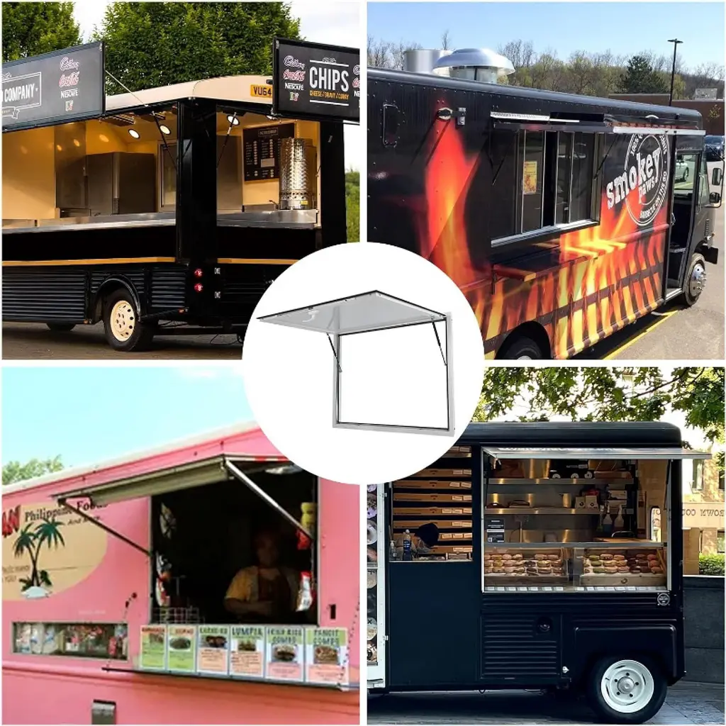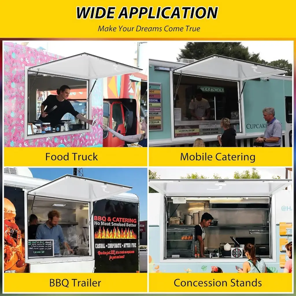 Upgrade your service window for smoother lines and a cleaner look. This unit features an aluminum‑alloy frame with a powder‑coated finish that resists corrosion and wipes clean for a professional look. Twin gas struts lift the awning smoothly and hold it open up to 85°, shielding staff and guests from rain and sun while you take orders. An integrated handle with locking mechanism pulls the panel tight to deter tampering during service, transport, or parking. Double waterproof sealing strips create a tight barrier that keeps water out to protect your interior and equipment. Built for food trucks, concession stands, catering trailers, and BBQ rigs, the sliding panels speed access and handoff at fairs, festivals, job sites, and local events. Note: glass not included.