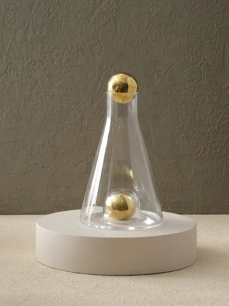 Modern, sculptural, and unexpected, the Cone-Shaped Glass Decanter with Brass Sphere Details transforms everyday function into a work of art. Crafted from clear glass in a sleek conical silhouette, this decanter is accented with gleaming brass spheres—one resting elegantly at the base, the other forming a polished spherical stopper. The transparent form allows the golden elements to shine from within, adding depth and visual intrigue. Whether used for serving or styled as a centerpiece, it brings a refined architectural touch to any contemporary space.