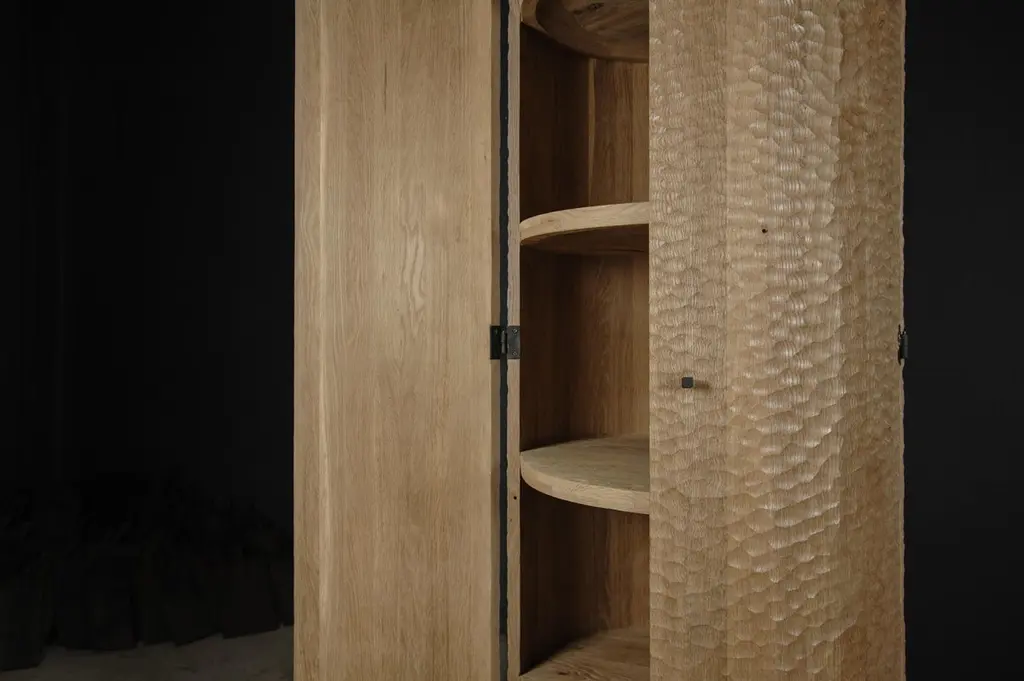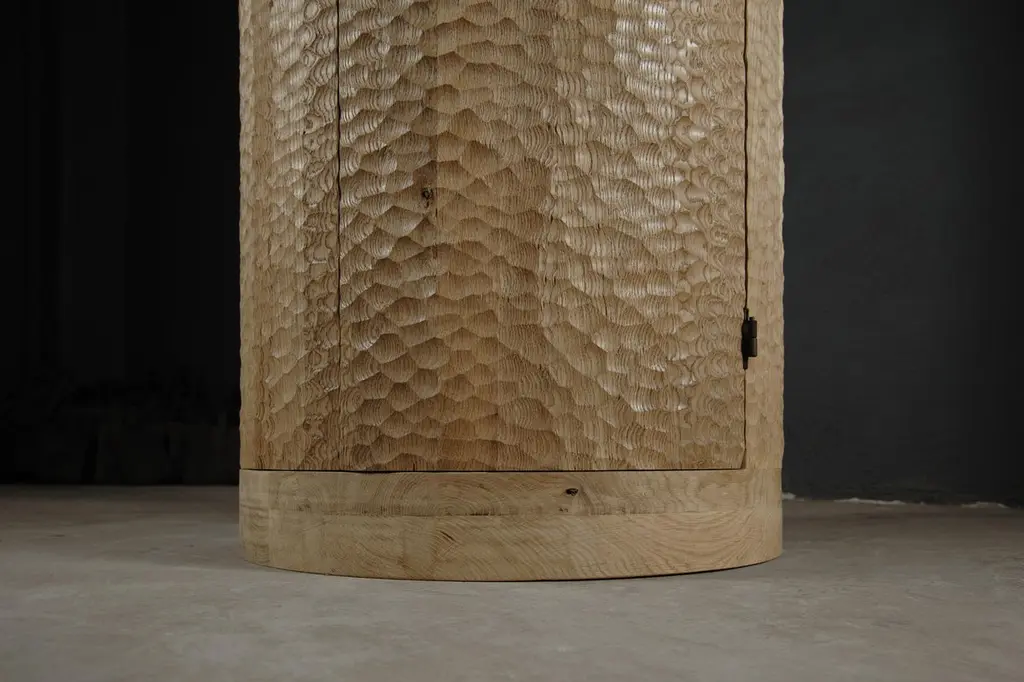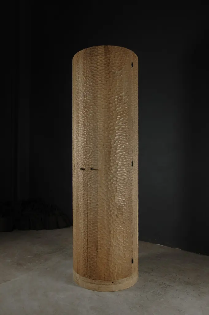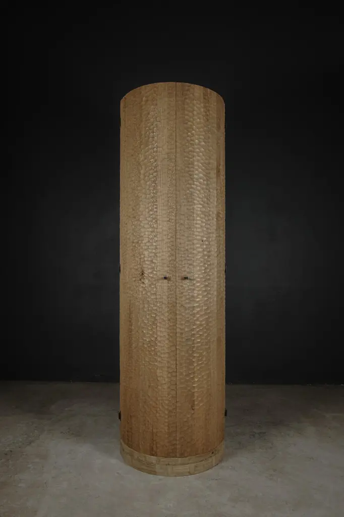 Contemporary Brutalist Column Cupboard made of solid oakDimensions: Height: 182 cmDiameter: 55 xmUnique piece made to order. Customizable.Founded by Denis Milovanov, SÓHA design studio conceives and produces furniture design and decorative objects in solid oak in an authentic style. Inspiration to create all these items comes from the Russian North aesthetics with its severe nature, log huts black from time and climate and scant patterns. Wood is masterfully hand processed with chainsaw or chisel, whereby producing beautiful surface patterns. The wood is soaked in boiling baths of linseed oil, creating this special patina and making each creation a very unique piece. Reacting with tanning substances under high temperature, oil gives the objects expressive and natural colours, from light brown to charcoal-black. ---------Artist, designer and the founder of DENIS MILOVANOV and SÓHA brands, Denis Milovanov is a regular partaker of prestigious international exhibitions and fairs such as PAD Paris, Maison&Objets, Design Miami/Basel. Milovanov received the Product Design award at the Interni Design Awards in 2016. He collaborated with Zaha Hadid Architects in 2012 and Boris Vervoordt in 2015. The designer was born on April 25, 1975, in Moscow. He studied woodworking at the 303 Higher Technical School in 1990-1993. In 2012 Milovanov established DENIS MILOVANOV workshop where he created design-art objects and the functional kitchen utensils series. In 2016 he established the SÓHA brand.