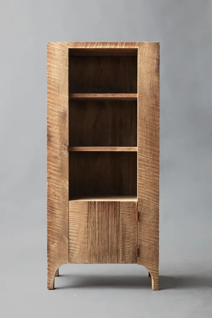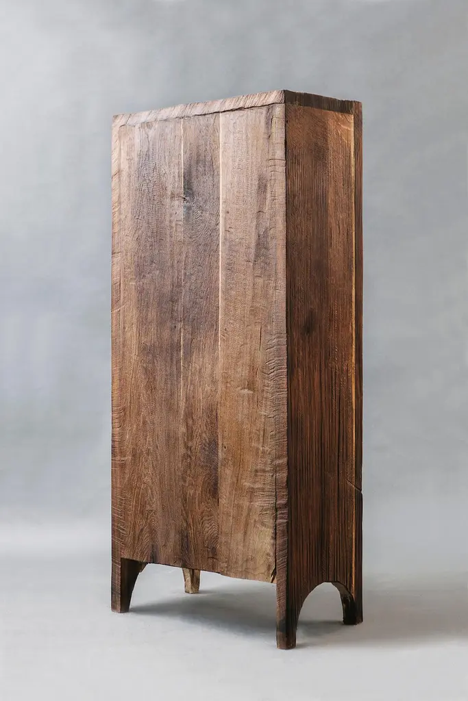 Cupboard made of solid oak (+ linseed oil)Measures: 175 x 80 x 40 cmSÓHA design studio conceives and produces furniture design and decorative objects in solid oak in an authentic style. Inspiration to create all these items comes from the Russian North aesthetics with its severe nature, log huts black from time and climate and scant patterns. Wood is masterfully hand processed with chainsaw or chisel, whereby producing beautiful surface patterns. The wood is soaked in boiling baths of linseed oil, creating this special patina and making each creation a very unique piece. Reacting with tanning substances under high temperature, oil gives the objects expressive and natural colours, from light brown to charcoal-black. SÓHA offers a vast array of neo-primitivist interior objects. Our kitchen utensil, wall panels, sculptures and furniture solutions are executed in one unique style and will organically fit into the interior of your home. Each piece is one-of-a-kind handmade product.Unique piece made to order.