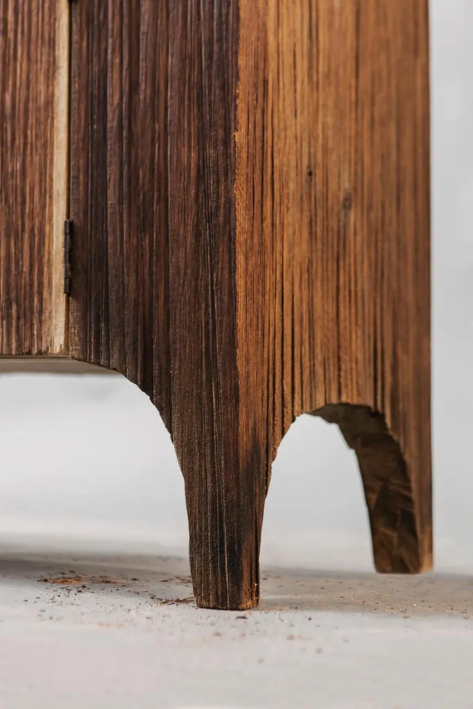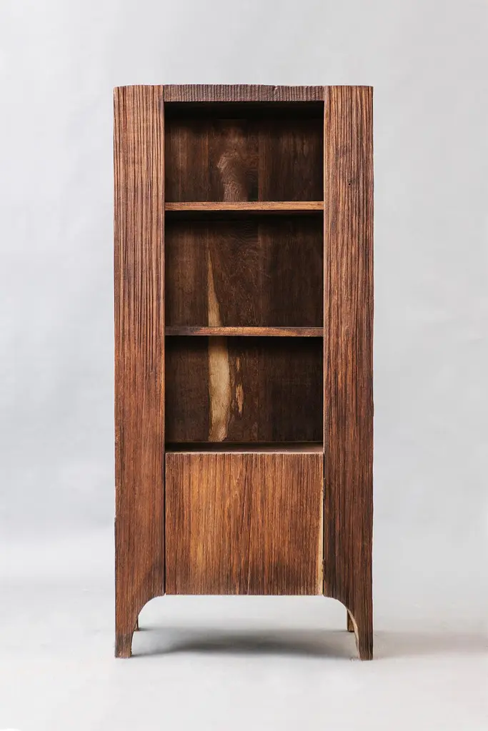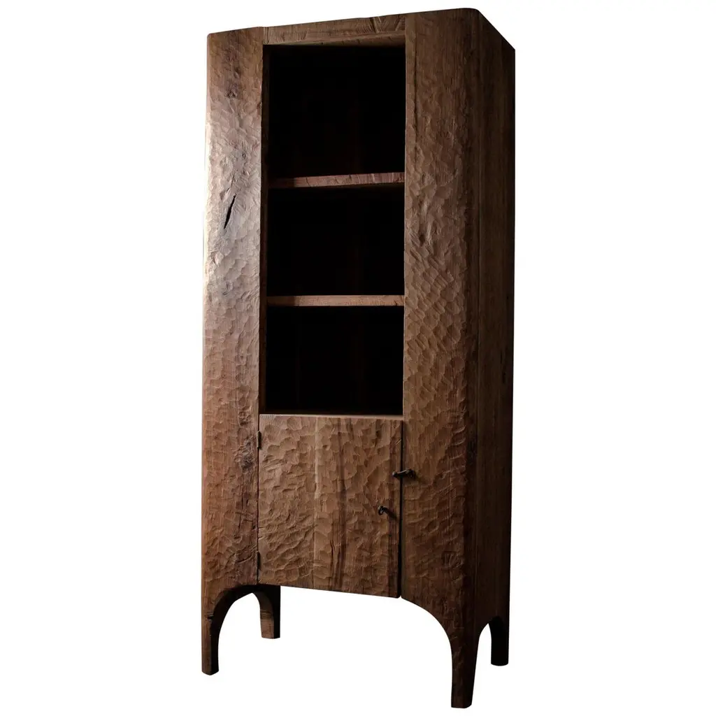 Cupboard made of solid oak (+ linseed oil)Measures: 175 x 80 x 40 cmSÓHA design studio conceives and produces furniture design and decorative objects in solid oak in an authentic style. Inspiration to create all these items comes from the Russian North aesthetics with its severe nature, log huts black from time and climate and scant patterns. Wood is masterfully hand processed with chainsaw or chisel, whereby producing beautiful surface patterns. The wood is soaked in boiling baths of linseed oil, creating this special patina and making each creation a very unique piece. Reacting with tanning substances under high temperature, oil gives the objects expressive and natural colours, from light brown to charcoal-black. SÓHA offers a vast array of neo-primitivist interior objects. Our kitchen utensil, wall panels, sculptures and furniture solutions are executed in one unique style and will organically fit into the interior of your home. Each piece is one-of-a-kind handmade product.
