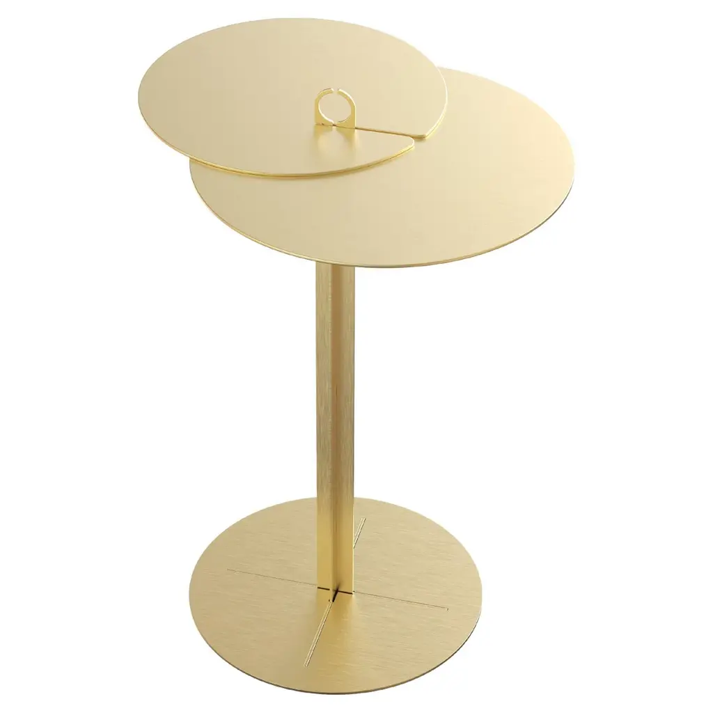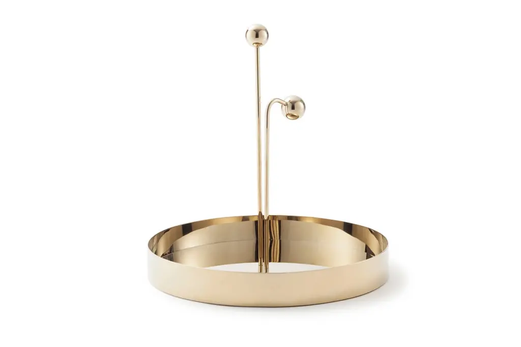 Contemporary cake standMeasures: Diameter 30, height 38 cmTray in natural color ash veneerBase and handle in plated metal-coated with glossy Pink Copper finishAvailable in 3 colors (Wood, Green or Yellow)From Earth, one can only see the portion of the Moon that is illuminated by the Sun. An image that is constantly changing as the Moon orbits the Earth. The collection draws its inspiration from this fascinating connectivity. Round shapes and glistening gold, champagne, copper and pink-copper metal finishes personify the Moon itself while handles and – for the side tables- legs represent the different lunar phases that change according to the positions of the Moon and Sun relative to the Earth. Light over darkness the off the Moon trays and side tables’ collection invite to a lunar dream.