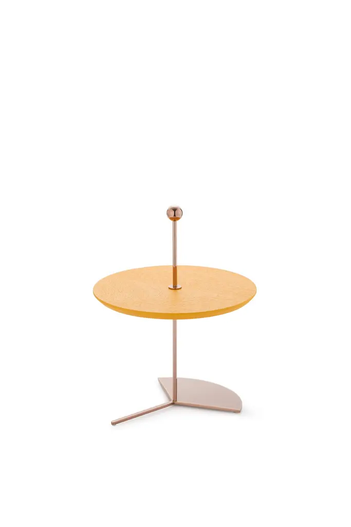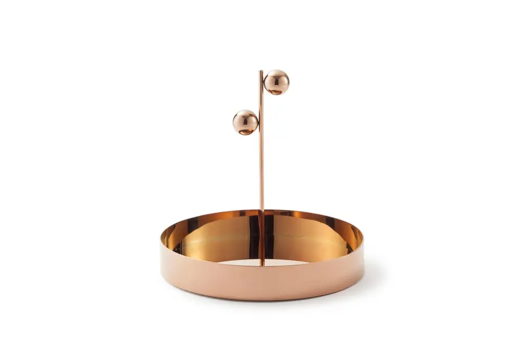 Contemporary cake standMeasures: Diameter 30, height 38 cmPlated metal-coated with glossy Champagne finishFrom Earth, one can only see the portion of the moon that is illuminated by the Sun. An image that is constantly changing as the moon orbits the Earth. The collection draws its inspiration from this fascinating connectivity. Round shapes and glistening gold, Champagne, copper and pink-copper metal finishes personify the moon itself while handles and for the side tables- legs represent the different lunar phases that change according to the positions of the moon and sun relative to the Earth. Light over darkness the off the moon trays and side tables’ collection invite to a lunar dream.