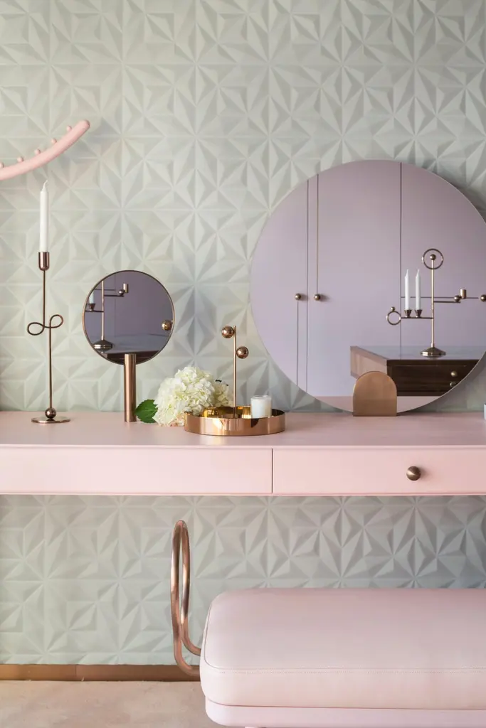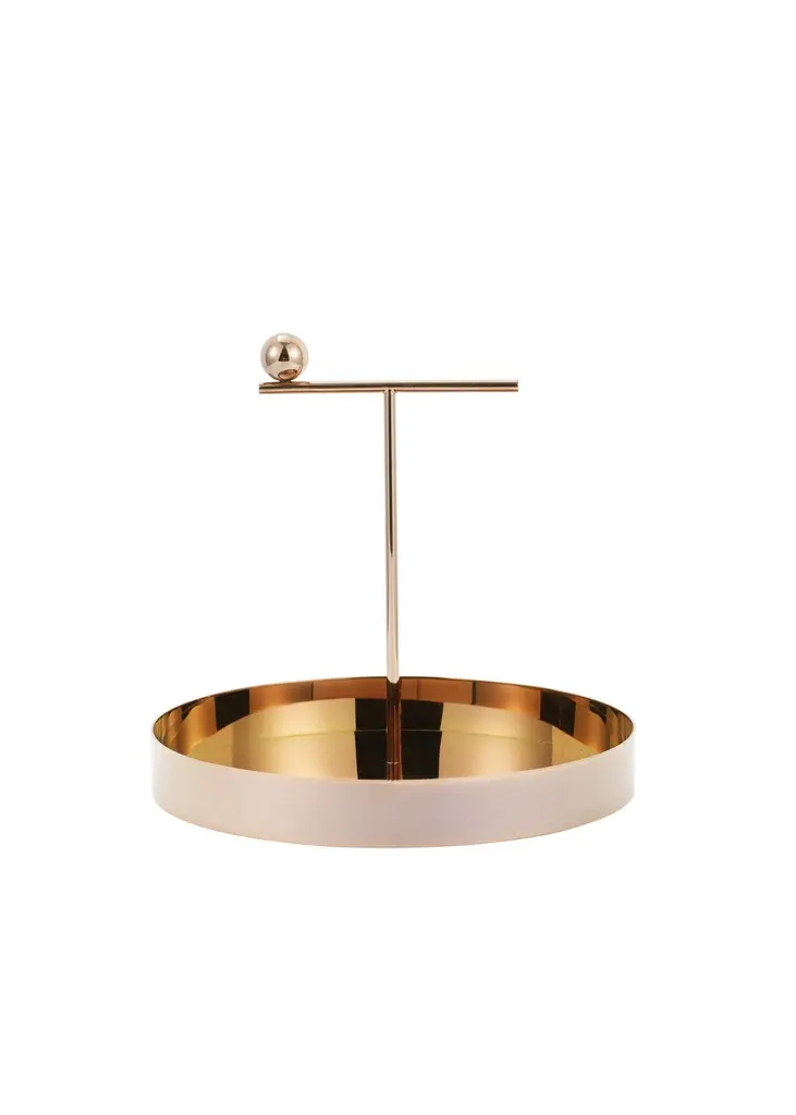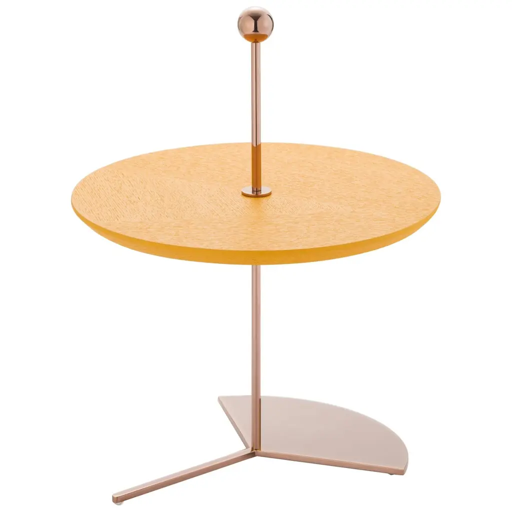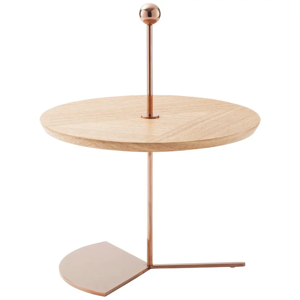 Contemporary cake standMeasure: Diameter 30 x height 38 cmTray in natural colour ash veneerBase and handle in plated metal coated with glossy Pink Copper finishAvailable in 3 colours (Wood, Green or Yellow)From Earth, one can only see the portion of the Moon that is illuminated by the Sun. An image that is constantly changing as the Moon orbits the Earth. The collection draws its inspiration from this fascinating connectivity. Round shapes and glistening gold, champagne, copper and pink-copper metal finishes personify the Moon itself while handles and – for the side tables- legs represent the different lunar phases that change according to the positions of the Moon and Sun relative to the Earth. Light over darkness the Off the Moon trays and side tables’ collection invite to a lunar dream.