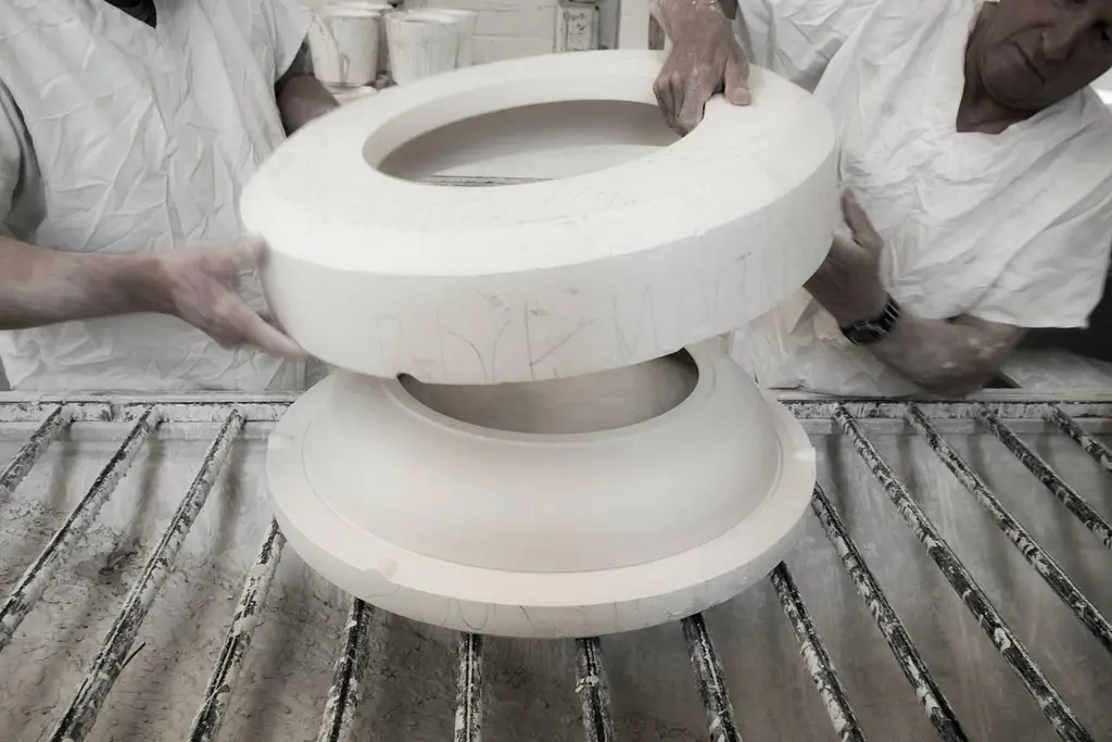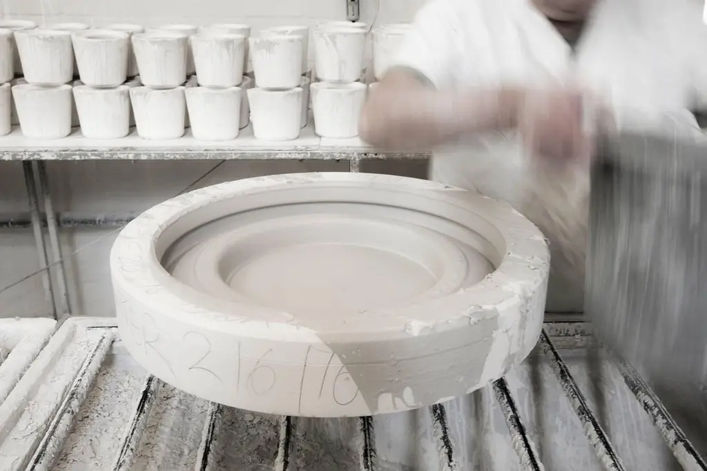 Cast bowl, 1882 Ltd. with John Pawson. Cast bowl is conceived as a quiet landscape in ceramic. Glazed in the palest of hues, the play of light and shadow generates endless small shifts of tone across its contours. The piece draws on a particular set of architectural preoccupations, with proportion, line, volume and the precise way in which mass engages with an underlying surface, combining apparent simplicity with rigorous geometry.