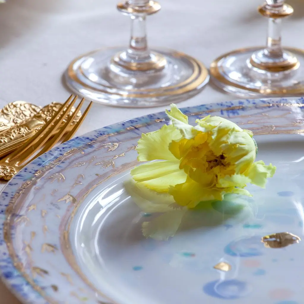Hand painted in Italy from the finest porcelain, this Dafne Rim Charger has a narrow pink and blue dotted rim surrounding a broad, delicate golden decor of stylized flowers; subtle light blue and pink brushes sprinkled with black powder float on the white enamel, enlivened by the golden dots.Rim charger, Ø31Villa Borghese, Dafne CollectionHand painted porcelainHand painted 24-karat goldMade in ItalyFirst introduced at Milan Design Week 2018, the Dafne line is named after a hall of the Borghese Gallery in Rome and evokes Renaissance and Baroque art eternal beauty underlined by the gold finishes.Each Coralla Maiuri product is entirely hand decorated. Each is a work of art. While ensuring consistency, they are never identical. Slight variations of decor and color from one to another are not only normal, but to be expected as a sign of their uniqueness.For large quantities, production lead time to be confirmedEven if all our tableware products are suitable for dishwasher machines, for long term conservation we warmly recommend to favour non-aggressive soap and delicate washing.Due to the presence of real 24-karat gold, this item is not suitable for microwave.