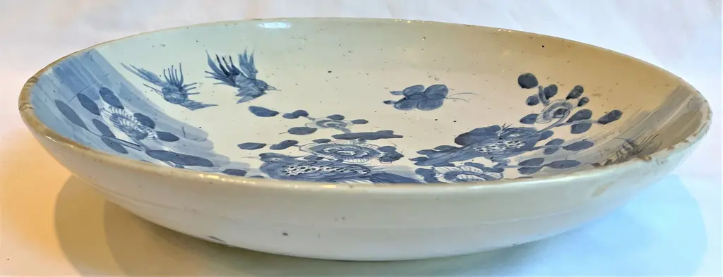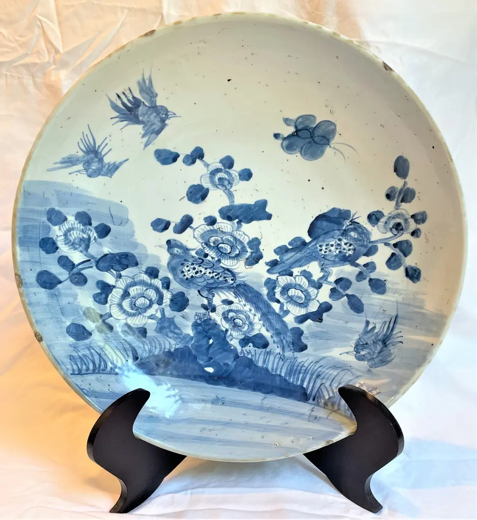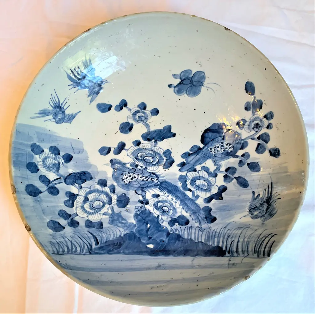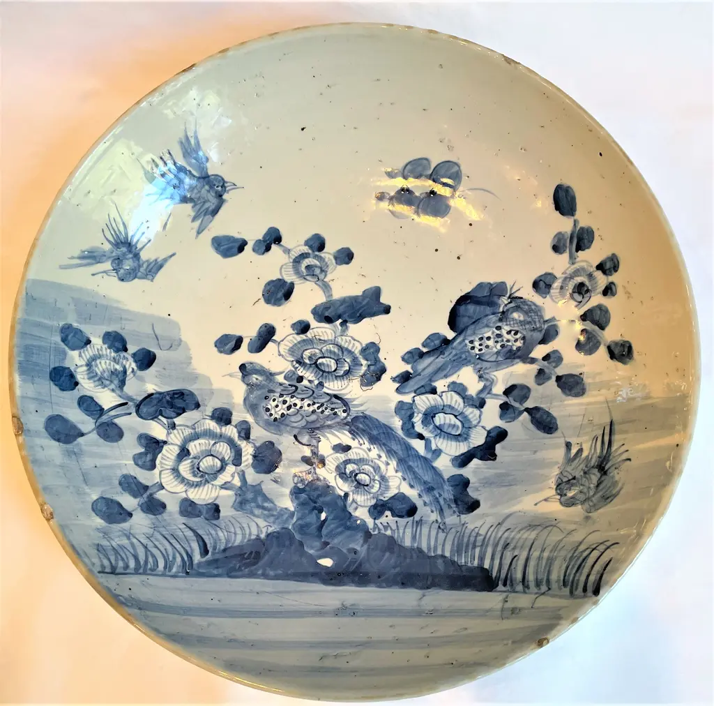This is a beautiful Chinoiserie shallow round platter. This is a heavy Chinese pottery with a hand painted pheasant and flowers. The platter is made with a "foot stomped" process to the clay that gives it a unique and often antiqued finish. The platter features birds resting in the brush with large flowers. This platter is a large round 16 inch in diameter and about 3 inches wide. It is perfect for a large decor piece resting as a center piece on a dining table or coffee table. It also looks great on a plate stand or hung in wall plate collection. This is a very high quality and beautiful hand painted art pottery piece.